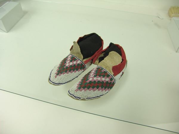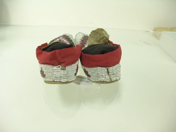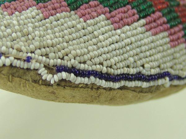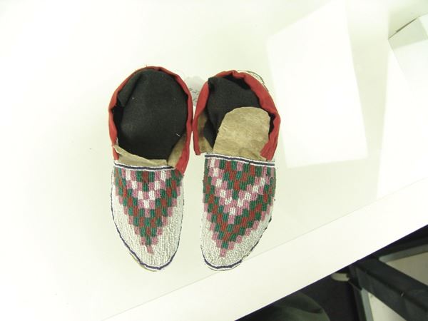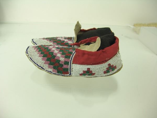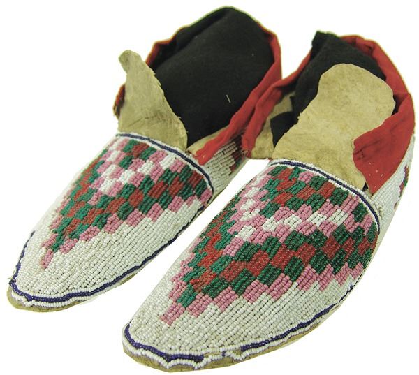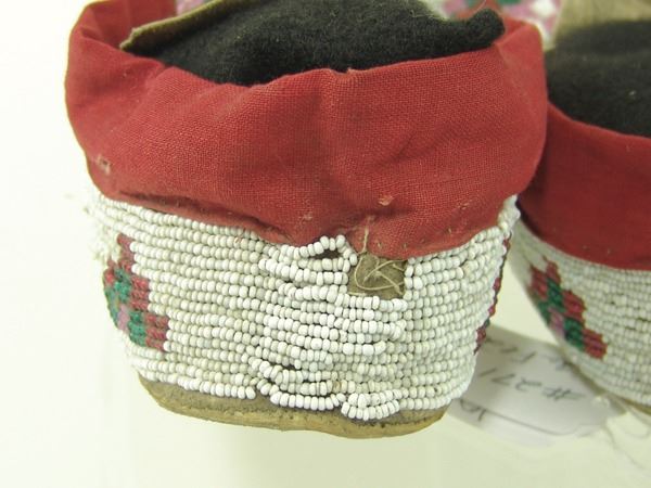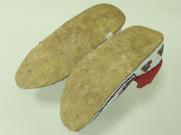 Early 1900s 10" Classic, early pair of sinew sewn, flat beaded moccasins with hard rawhide soles, and traditional chevron pattern on the vamps. Very good condition.