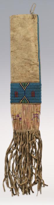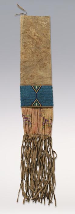 Assiniboine Beaded and Quilled Pipe Bag. 33" x 5 1/2". Buffalo hide. Geometric beadwork. C. 1880. Condition Report: Beadwork is intact. Quillwork nearly gone. Shows Indian use. Fair condition.