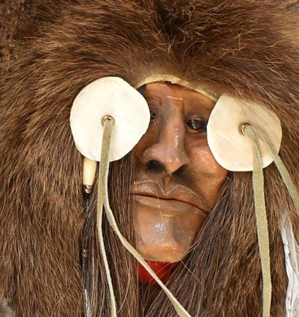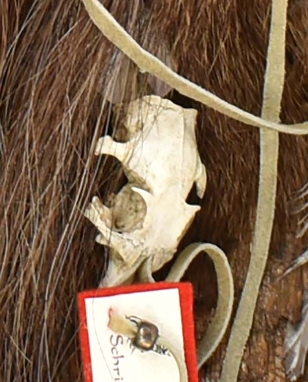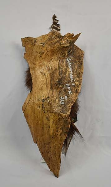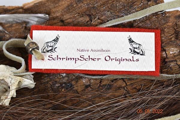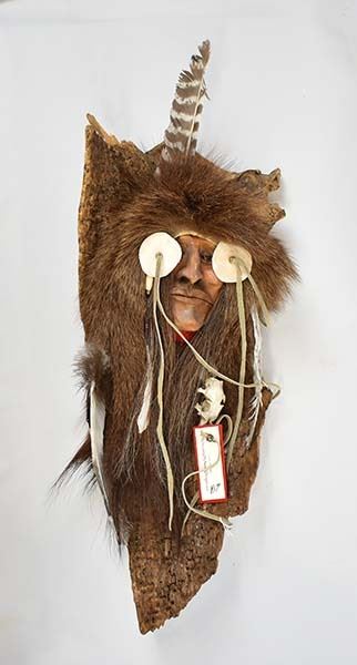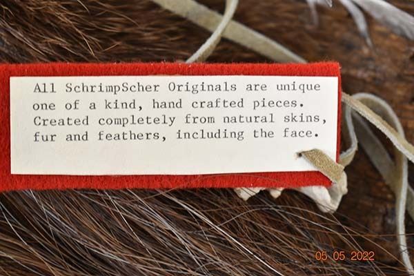 Native American Assiniboine Mask by Schrimpscher, measures 10'' x 29'' which includes the feather, hand crafted with antelope hide, deer hide, horse tail, wood, and feathers