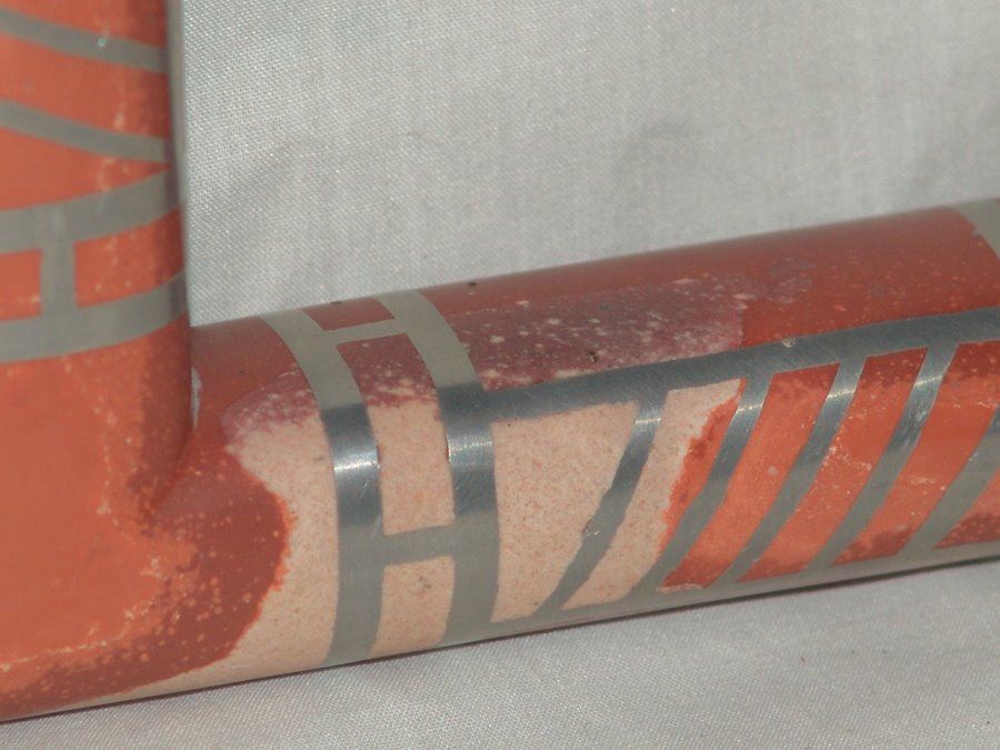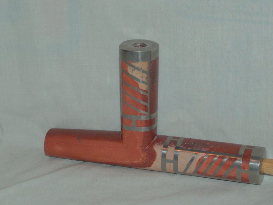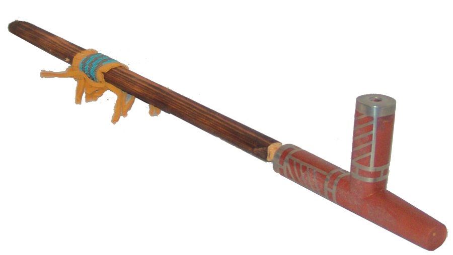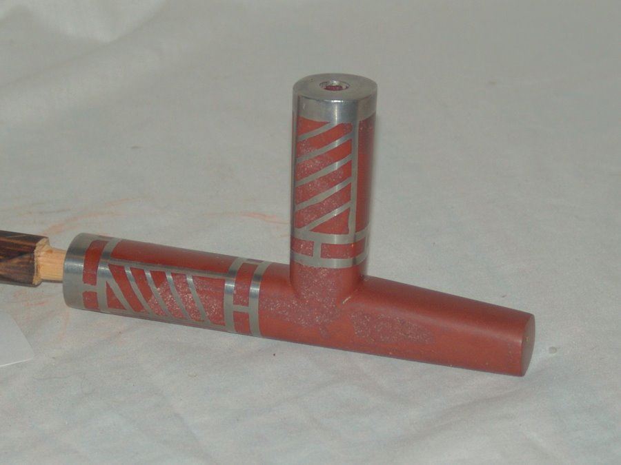 Beautiful hand carved catlinite T-bowl pipe head with finely inlaid pewter features and with wooden stem, purchased at Pipestone Museum, MN. 1998. Very good condition.,Late 1900s,24"