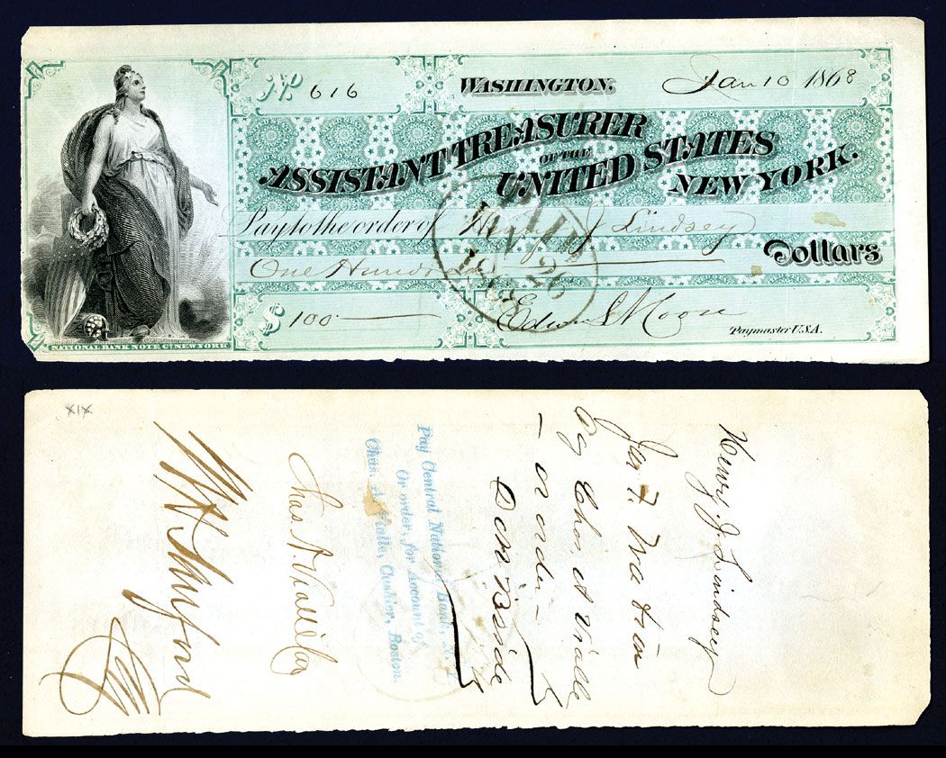 Washington, D.C., 1868, $100, Issued check by "Paymaster U.S.A." with well known Standing Liberty vignette on left in black with green underprint with counterfeit protectors. Printed by National BNC. XF condition. Very attractive and scarce military federal check.