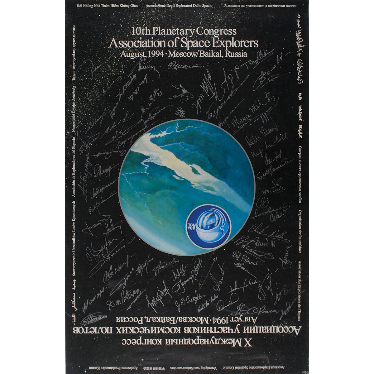 Color limited edition 22 x 34 print for the 10th Planetary Congress of the Association of Space Explorers in Moscow in 1994, numbered 101/127, signed in silver ink by 67 of the participating astronauts from 17 nations. Signers are: Svetlana Savitskaya (the first woman to walk in space; a scarce signature as she does not sign), Loren Acton, Viktor Afansyev, Toyohiro Akiyama, Vladimir Aksyonov, Sultan bin Salman as-Saud, Buzz Aldrin, Alexander Alexandrov, Anatoli Artsebarsky, Oleg Atkov, Toktar Aubakirov, Alexander Balandin, Georgi Beregovoi, Anatoli Berezovoi, Karol Bobko, Roberta Bondar, Scott Carpenter, John Creighton, Vladimir Dzhanibekov, John Fabian, Mohammed Faris, Bertalan Farkas, Anatoli Filipchenko, Dirk Frimout, Owen Garriott, Yuri Glazkov, Georgi Grechko, Alexei Gubarev, Miroslaw Hermaszewski, Alexander Ivanchenkov, Alexander Kaleri, Yevgeni Krunov, Pytor Klimuk, Vladimir Kovolyonok, Valeri Kubasov, Alexei Leonov, Byron Lichtenberg, Don Lind, Jack Lousma, Vladimir Lyakhov, Oleg Makarov, Gennadi Manakov, Jon McBride, Ulf Merbold, Mamoru Mohri, Donald Peterson, Alexander Poleshchuk, Dumitru Prunariu, Vladimir Remek, Stuart Roosa, Nikolai Rukavishnikov, Viktor Savinykh, Alexander Serebrov, Helen Sharman, Anatoli Solovyov, Thomas Stafford, Valentina Tereshkova, Gherman Titov, Michel Tognini, Vasili Tsibliev, Yuri Usachev, Vladimir Vasyutin, Franz Viehböck, Alexander Volkov, Boris Volnyov, Charles Walker, and Boris Yegorov. Accompanied by a Certificate of Witness signed by Charlie Walker, who attests to the authenticity (as he personally witnessed the signings). Rolled and in fine condition, with some scattered light edge dings and creases.