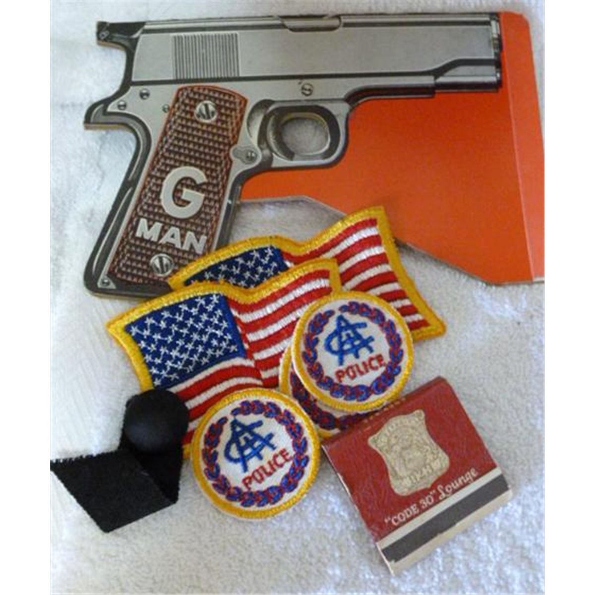 Assort lot police and American flag patches - matches black ribbon - and cardboard pop out G Man gun - Detroit Police