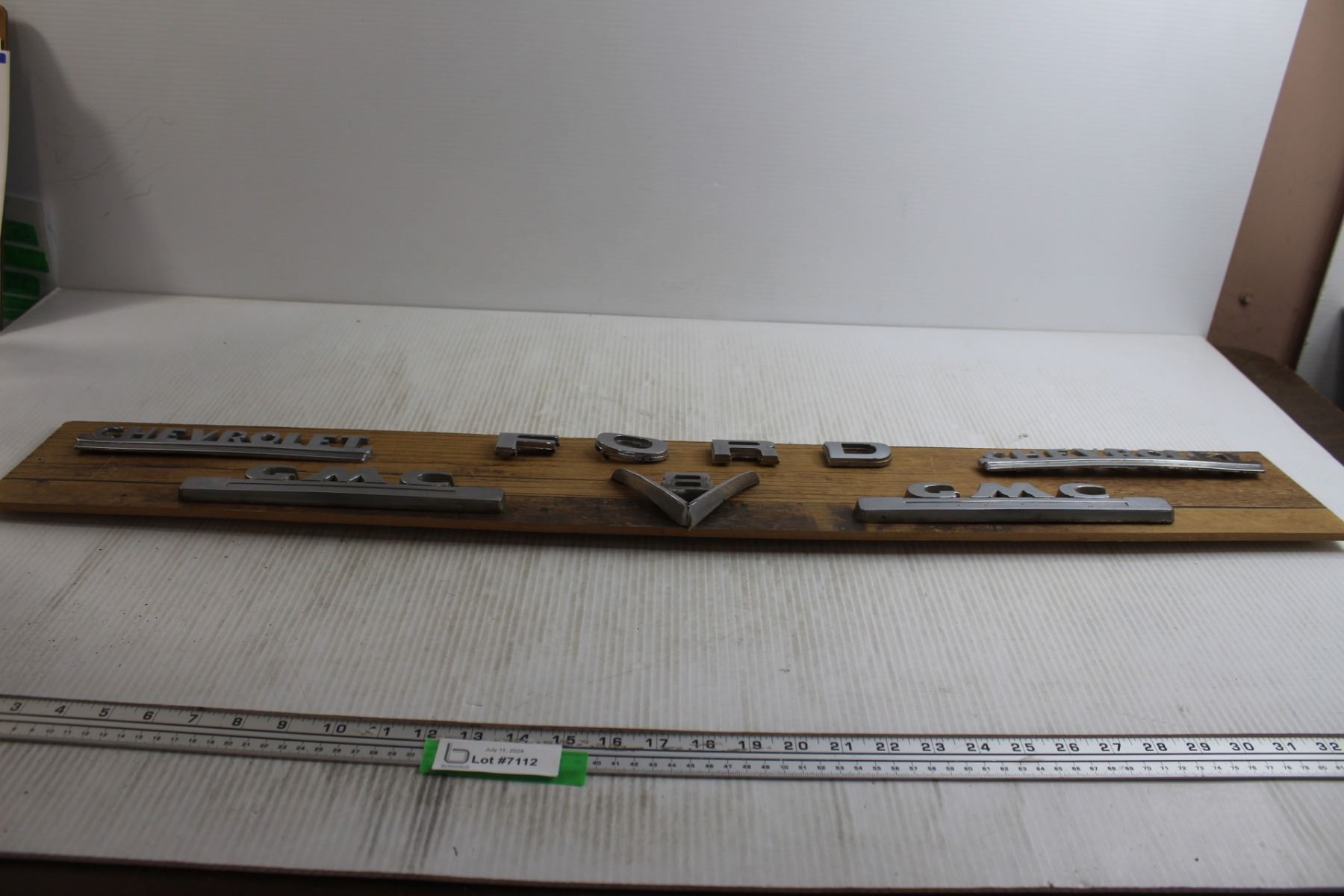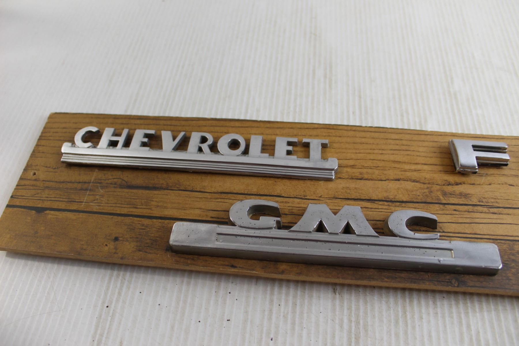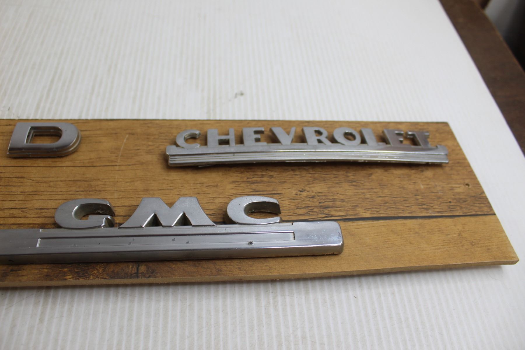 Assorted 1950's Truck Chrome Emblems on board-39"x6"