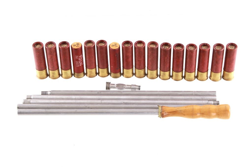 For your consideration, this lot features assorted vintage loaded 20 ga. shotgun shells from Federal, Peters & Rem-UMC, 24 in total. It is not known if these are original manufactures or reloads. Also in this lot is a Marble Arms Cleaning Rods set in the original canvas bag; the wood handle shows repair, and the rods appear to be in good condition. It measures 13" H x 1.75" W.