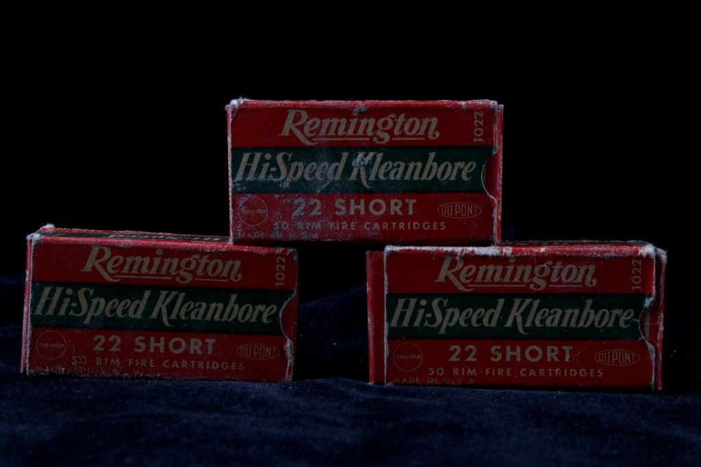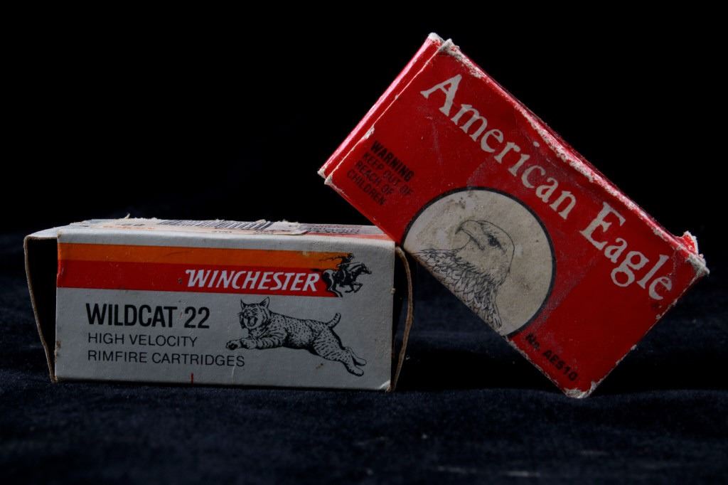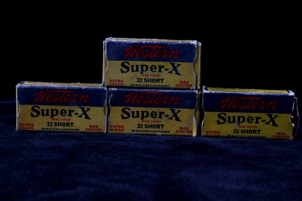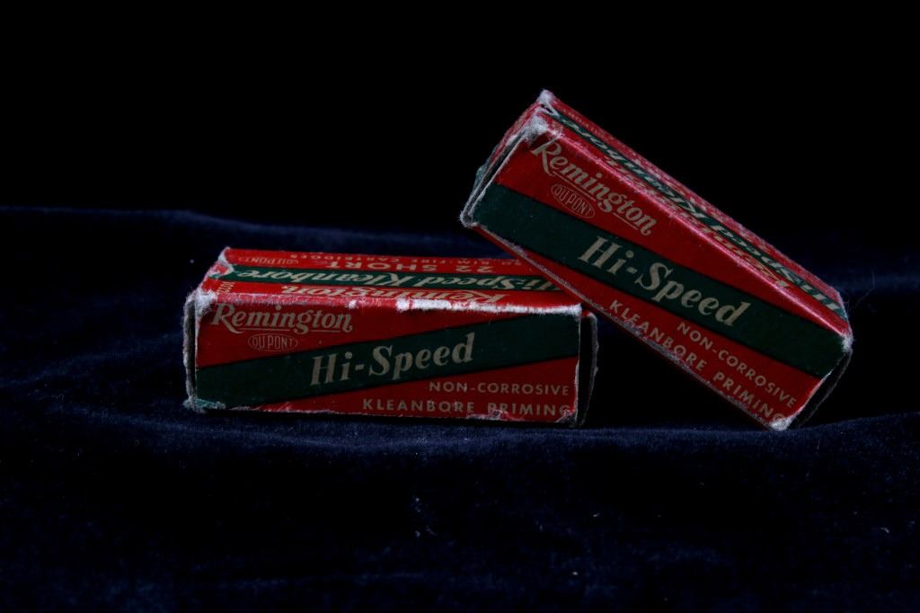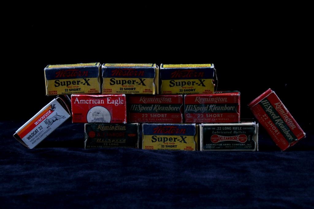 Included in this lot is a collection of assorted .22 caliber box ammunition. There are four Western Super-X .22 Short boxes. All show bright yellow, deep blues and vibrant red coloration. There are an additional three Remington Hi-Speed Kleanbore .22 Short boxes as well. They show some wear but still retain good color. Also included in the collection is a Remington Kleanbore .22 LR box, a Remington Kleanbore Hi-Speed .22 LR box, an American Eagle .22 LR High Velocity box and a Winchester Wildcat 22 box all in good condition. The boxes are full with the exception of the two Remington Kleanbore boxes which are partial fills.