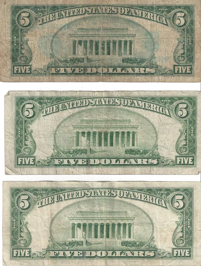 One Assorted $5 Blue and Red Seal Bill Lot of 5. Dates featured: (1) 1934 Blue Seal; (1) 1953 Blue Seal; (1) 1953B Red Seal (1) 1953C Red Seal; (1) 1963 Red Seal.