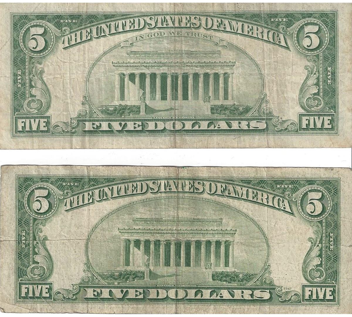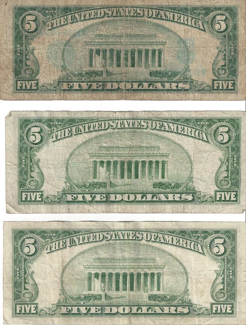 One Assorted $5 Blue and Red Seal Bill Lot of 5. Dates featured: (1) 1934 Blue Seal; (1) 1953 Blue Seal; (1) 1953B Red Seal (1) 1953C Red Seal; (1) 1963 Red Seal.