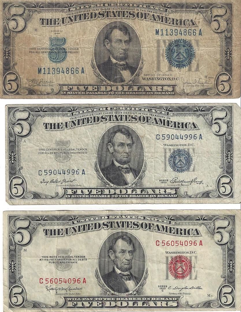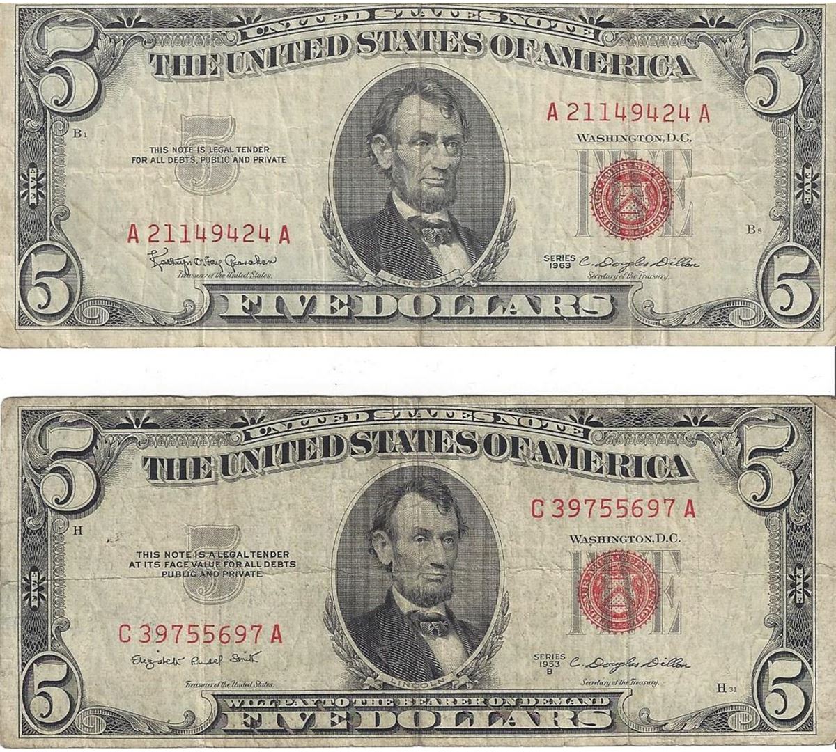 One Assorted $5 Blue and Red Seal Bill Lot of 5. Dates featured: (1) 1934 Blue Seal; (1) 1953 Blue Seal; (1) 1953B Red Seal (1) 1953C Red Seal; (1) 1963 Red Seal.