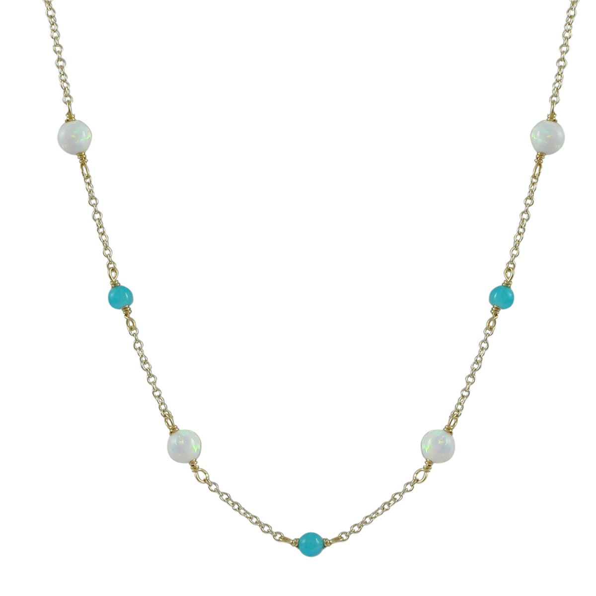 Assorted 6Mm Opal Balls And 4Mm Blue Balls Gold Tone Brass Necklace -16" 2"
