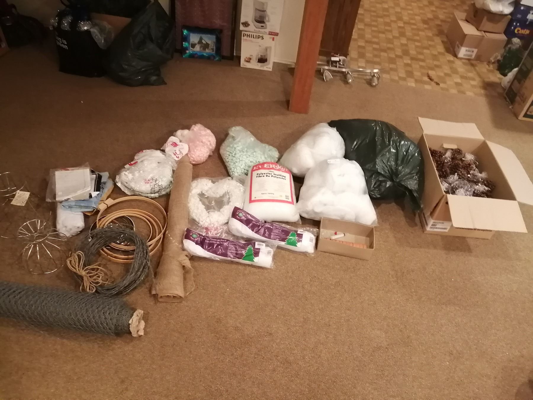 Includes stuffing, packing peanuts, burlap, lamp shade moulds, pine cones, and, chicken wire, barbed wire, and more!