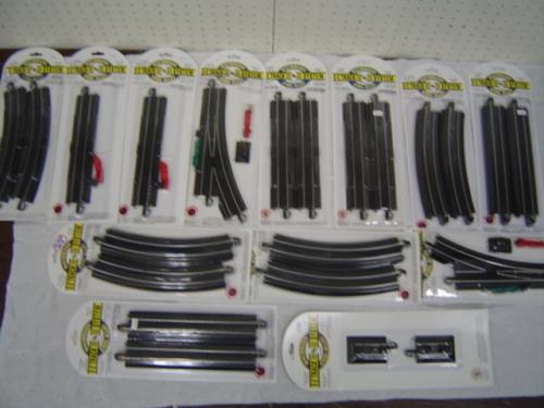 Bachmann EZ track steal black roadbed, 2 # 44410 9" straight terminal rerailer w/ , # 44461 remote switch left, 2 # 44428 9" straight rerailer 2 pc, # 44403 22" radius curved track 2 pc, 2 # 44401 18" redius curved track 4 pc, # 44462 remote switch right, 44411 9 " Straight 4 pc, 44429 18" Radius Curved Rerailer 2 pc, 44491 Hayes Bumpers 2pc, 44441 90 degree 90 degree crossing