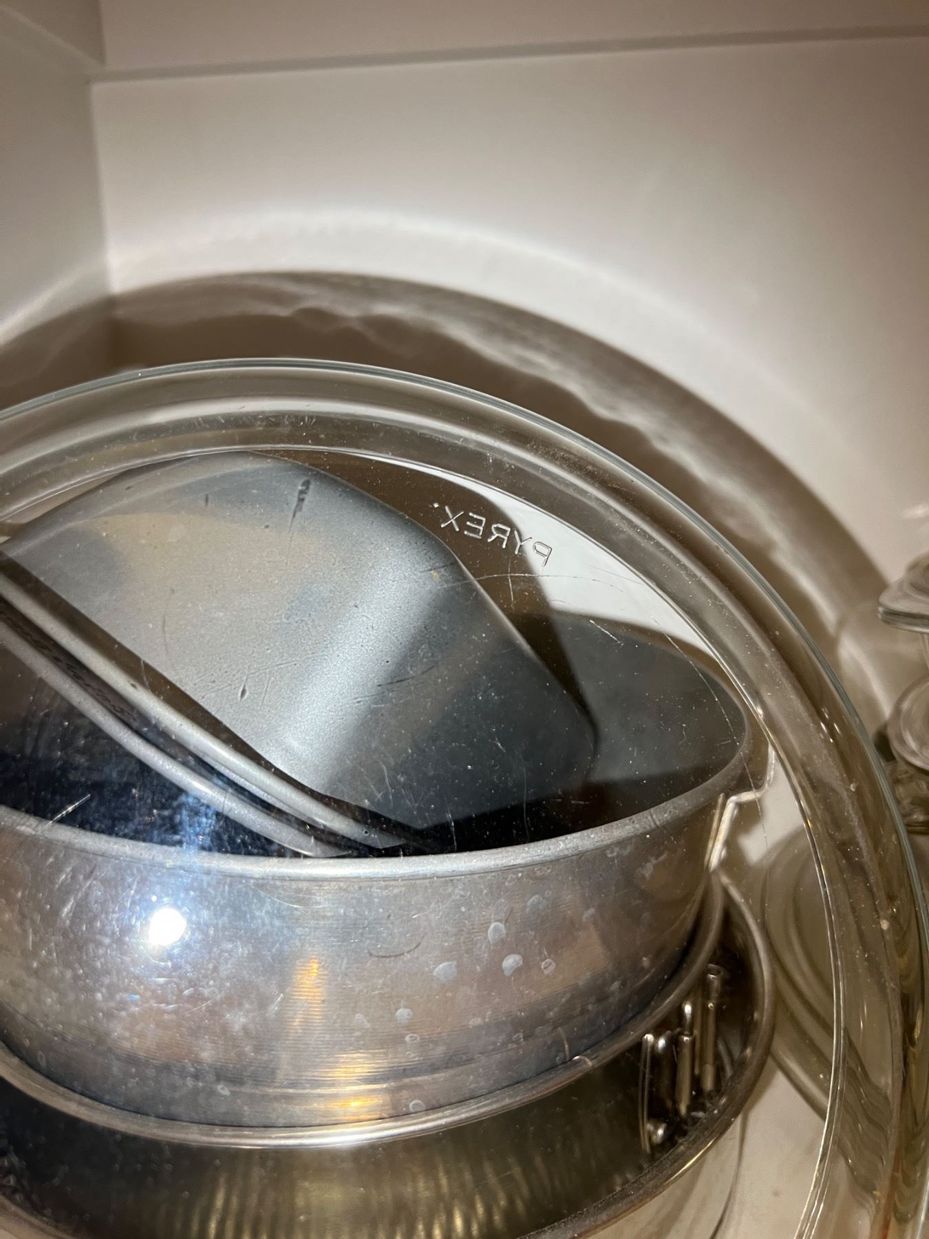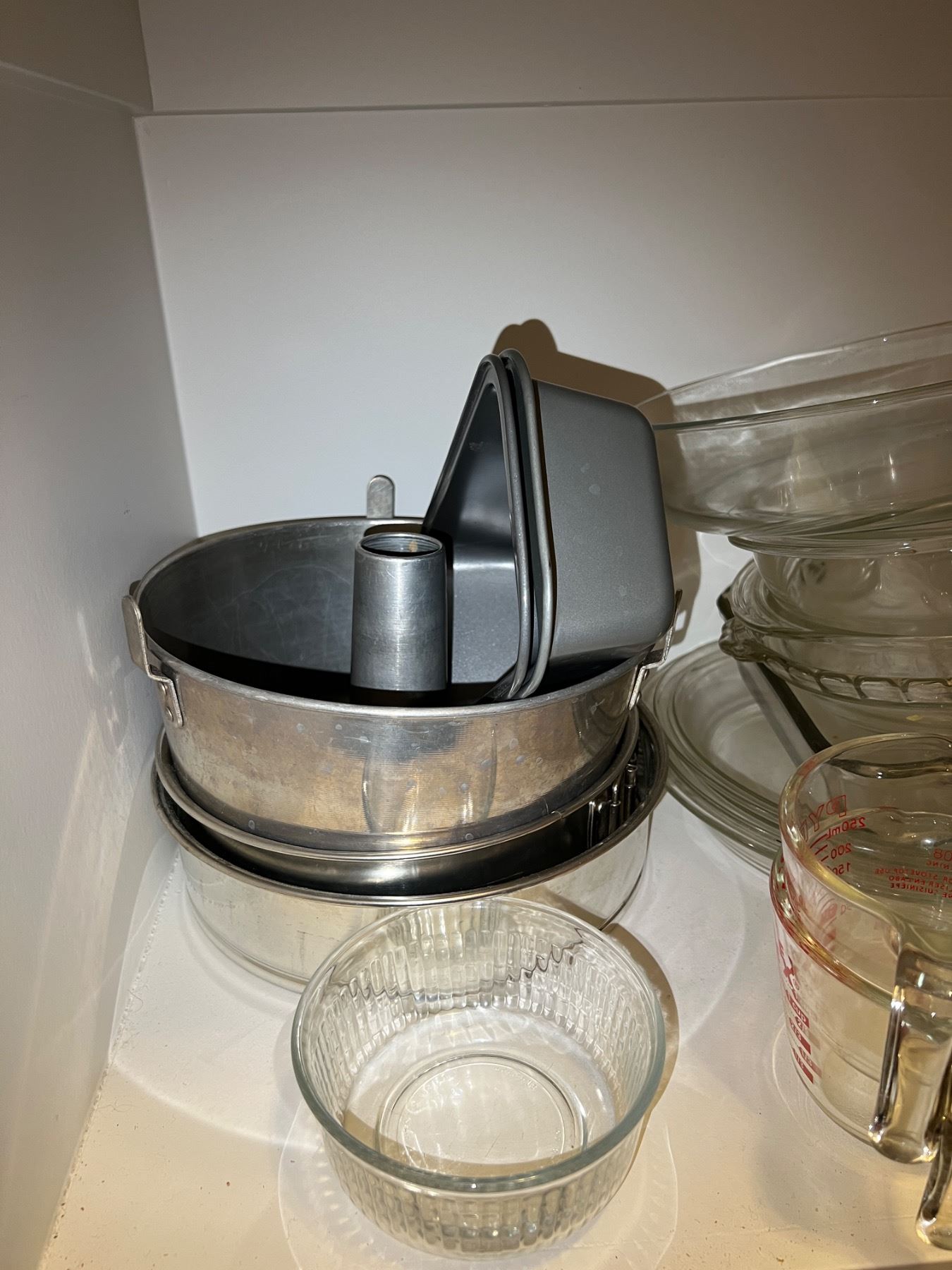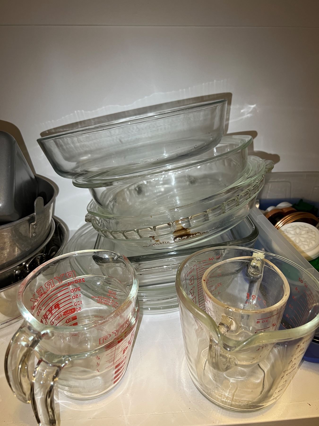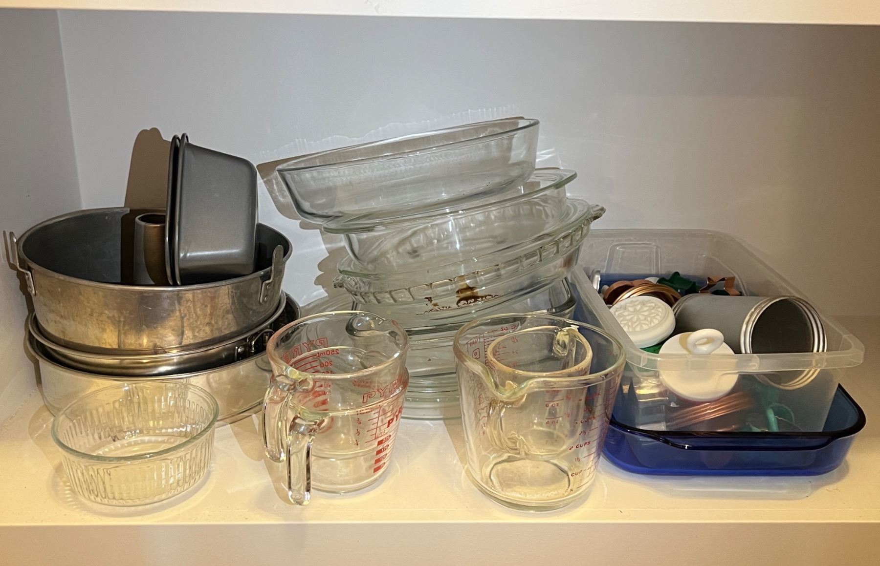 Mix of metal and glass baking dishes. Also includes glass pyrex measuring cups and more!