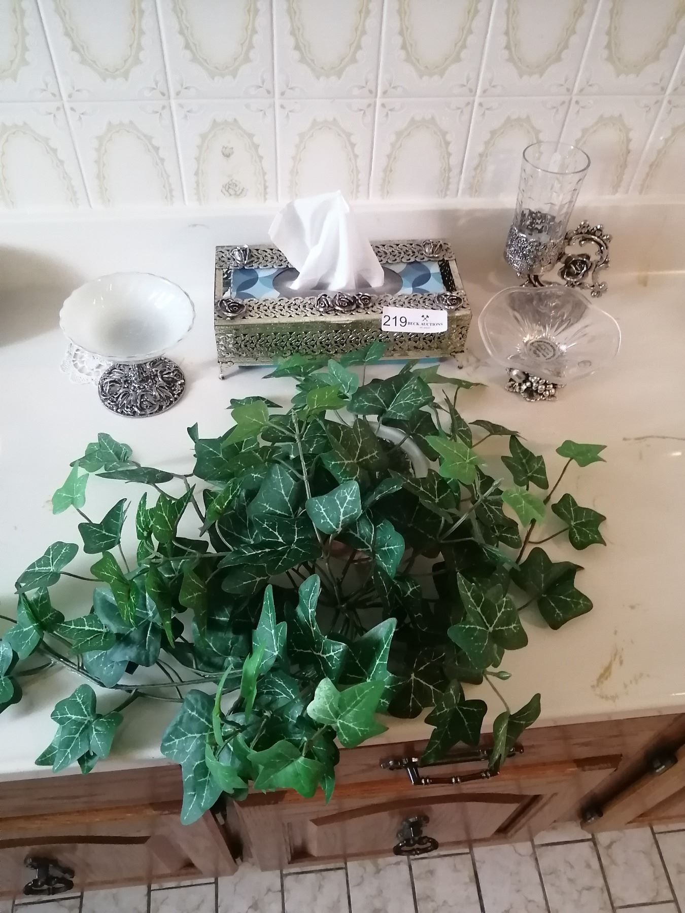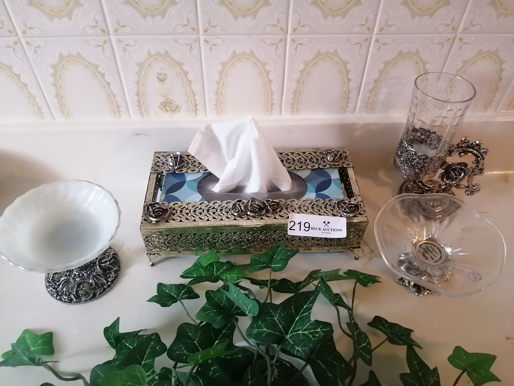 Assorted Bathroom Decor - with Artificial Plant, Metal Kleenex Box Cover, Ornate Glass Bowls, & More