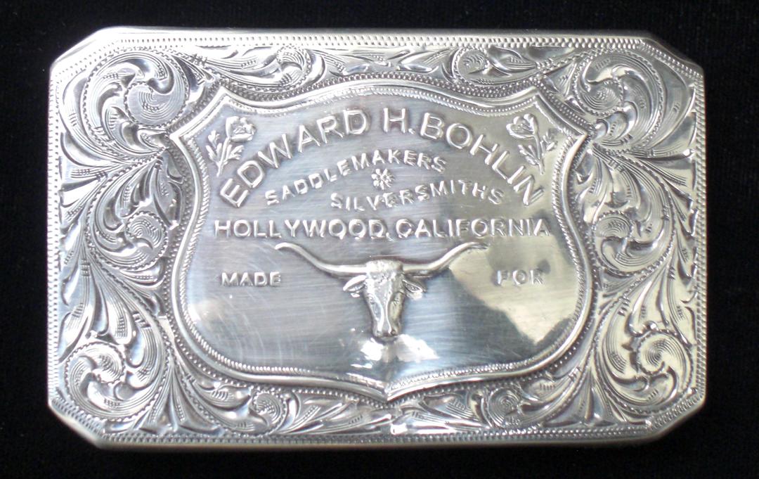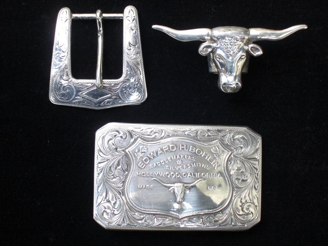 Assorted Bohlin lot includes Trophy Seat Plate Trophy Buckle, Longhorn Scarf Slide (this is a direct copy of Hopalong Cassidy's scarf slide.) , 1" Sterling Silver Buckle replica of original buckle Matt Damon wore in the movie, All The Pretty Horses. It is stamped with the Bohlin mark "ATPH".