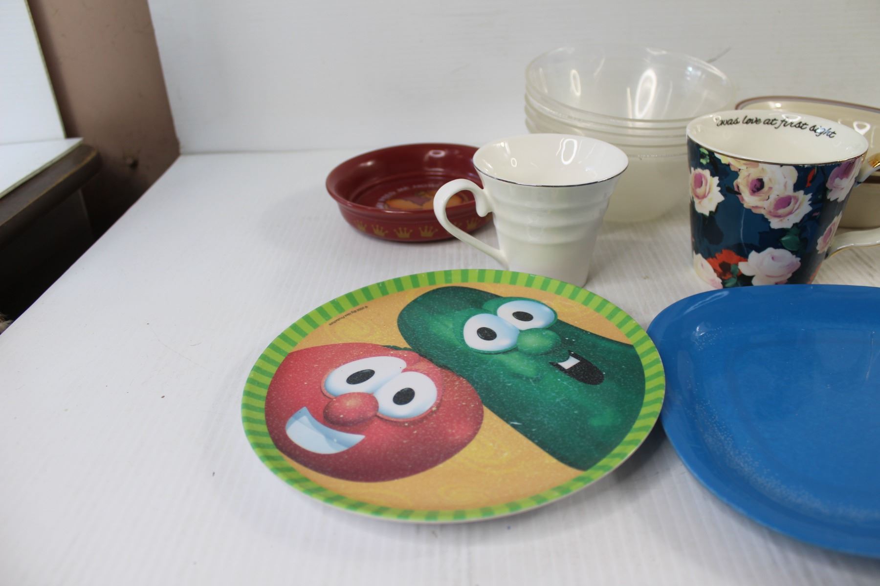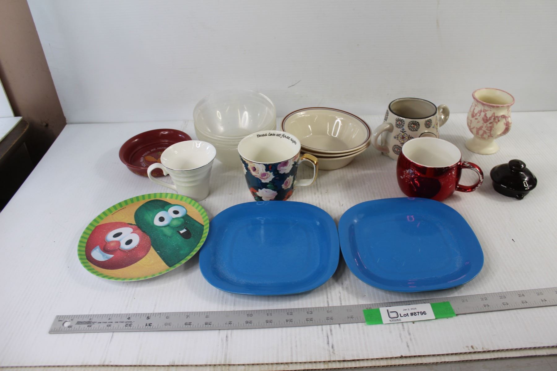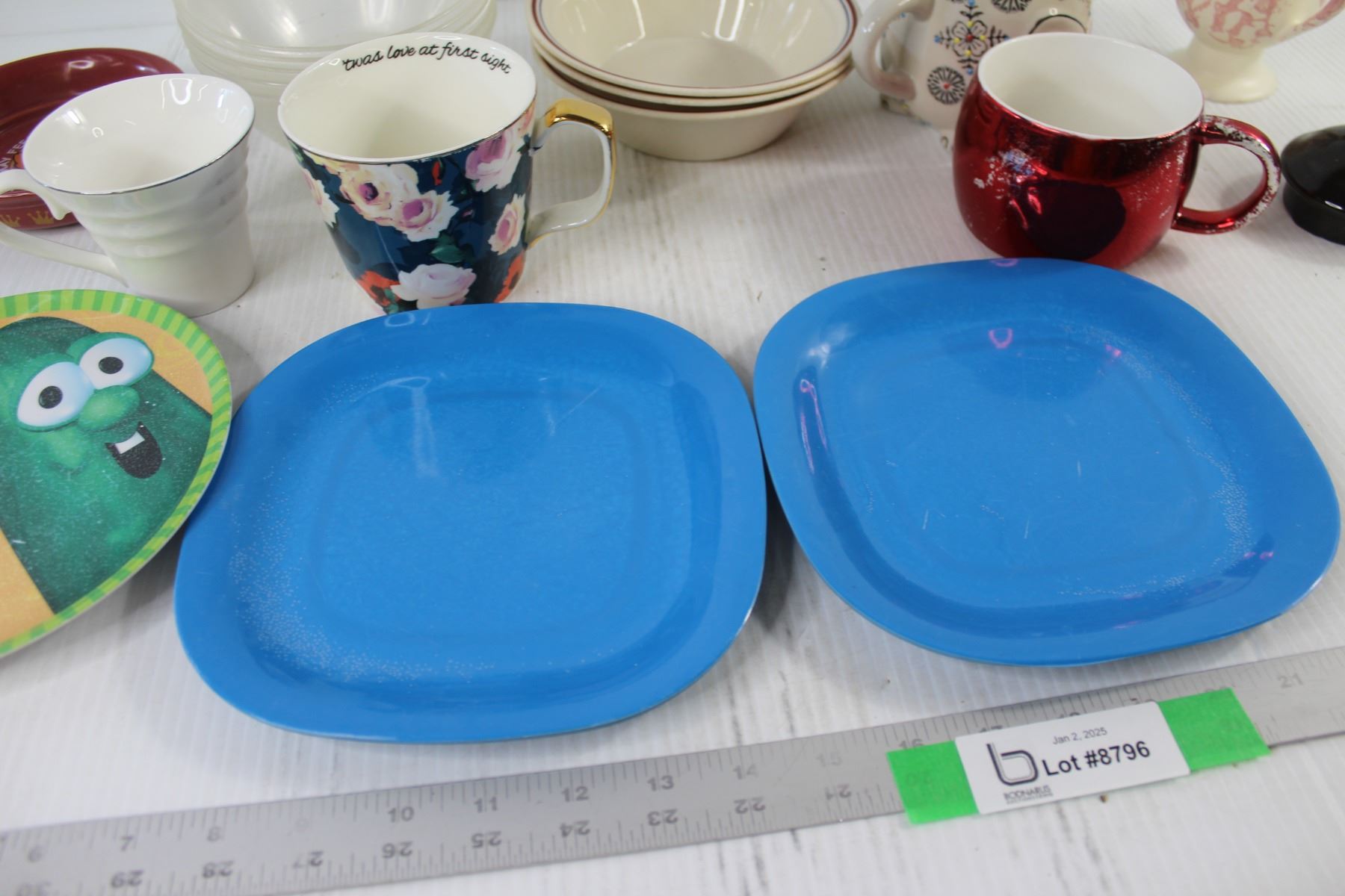 Assorted Bowls and Plates ( 1 is Veggie Tales), (4) Mugs, Candle Holder