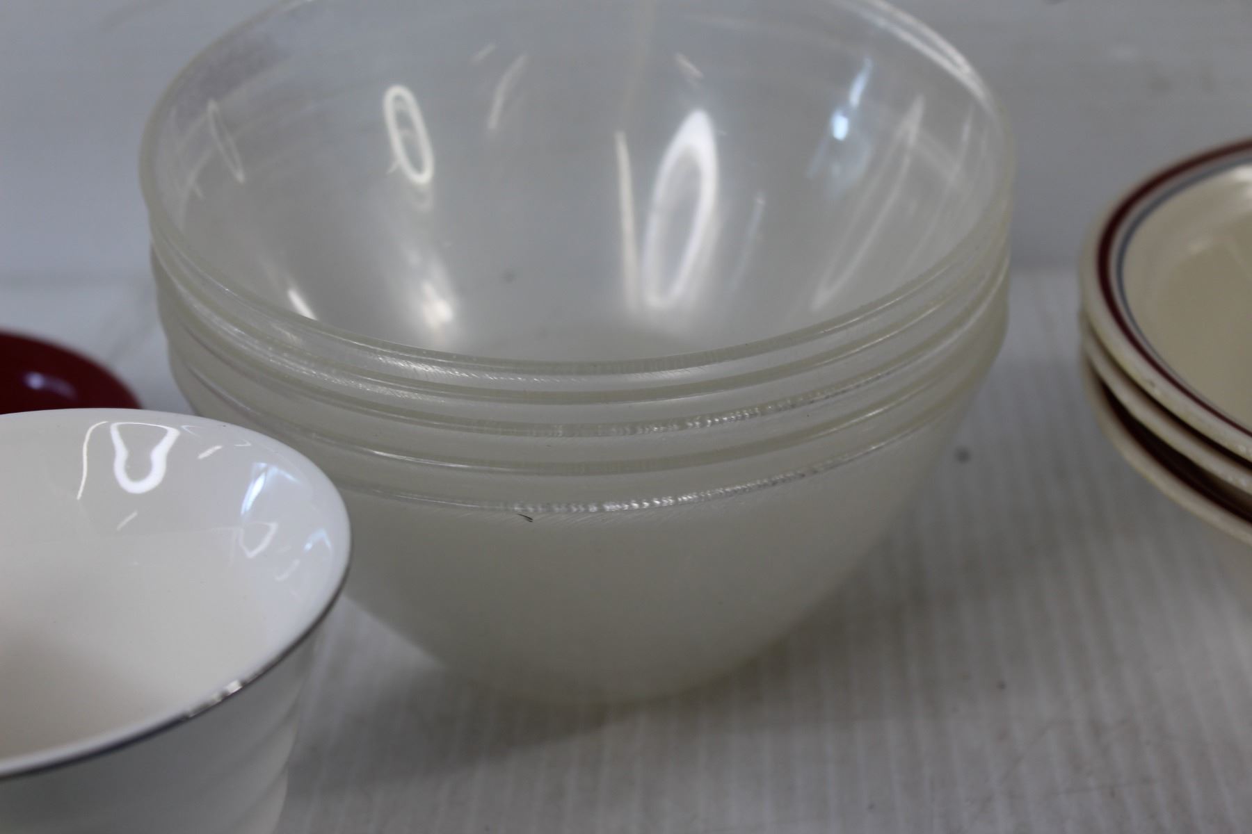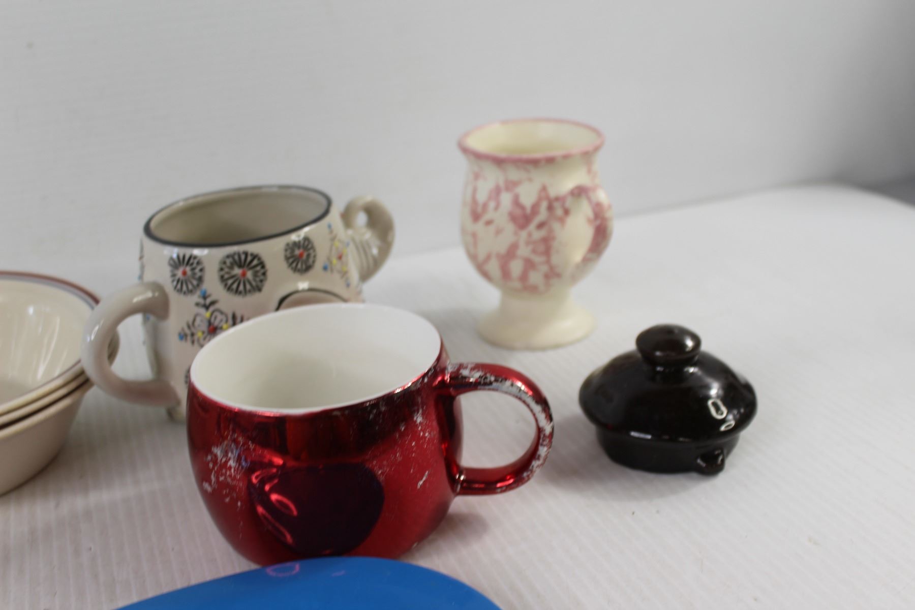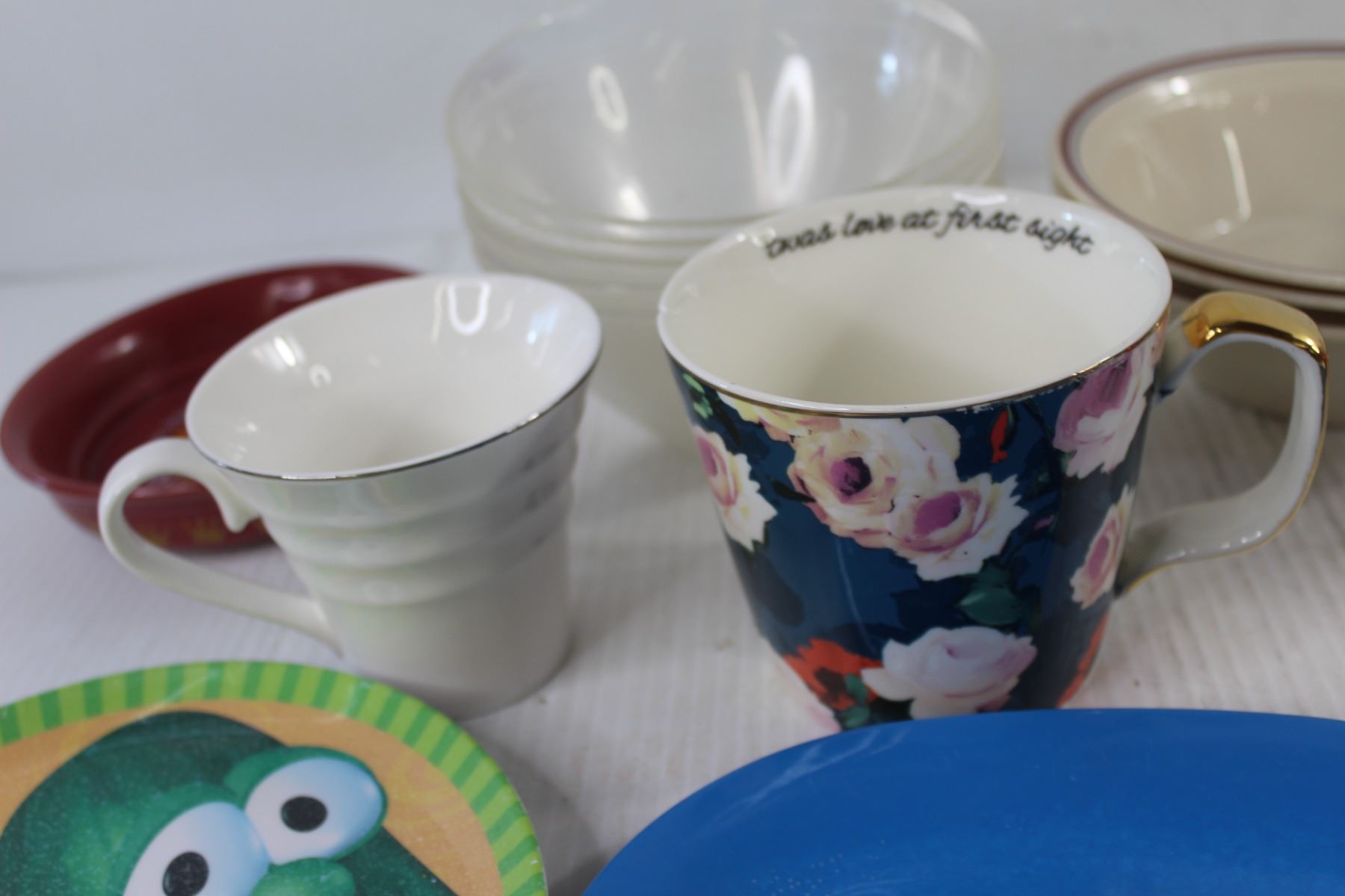 Assorted Bowls and Plates ( 1 is Veggie Tales), (4) Mugs, Candle Holder