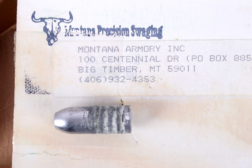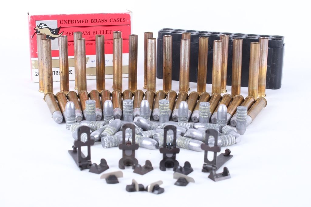 Lot containing one box of twenty new brass cases, .45 caliber, 2 7/8” length (.45-110 Sharps Straight caliber) with the original label marked “Unprimed Brass Cases, Bertram Bullet Co.” etc. (these are no longer made); one plastic ammo box containing twenty loaded .45 2 7/8” rounds headstamped “Norma.”; one box labeled “Prec. Cast Bullets, sized and lubed W/BPC, Cal. 45, 500 gr.” Box contains 34 bullets and was originally sold by Montana Armory, Big Timber, Montana (C. Sharps Arms); contained in this lot are also four Sharps Lawrence ladder rear barrel sights made by Shiloh Sharps of Montana: Two are of semi-buckhorn variety; two are of full buckhorn style; all come with correct mounting screws etc. as well as four blade front sights- all new and unused.