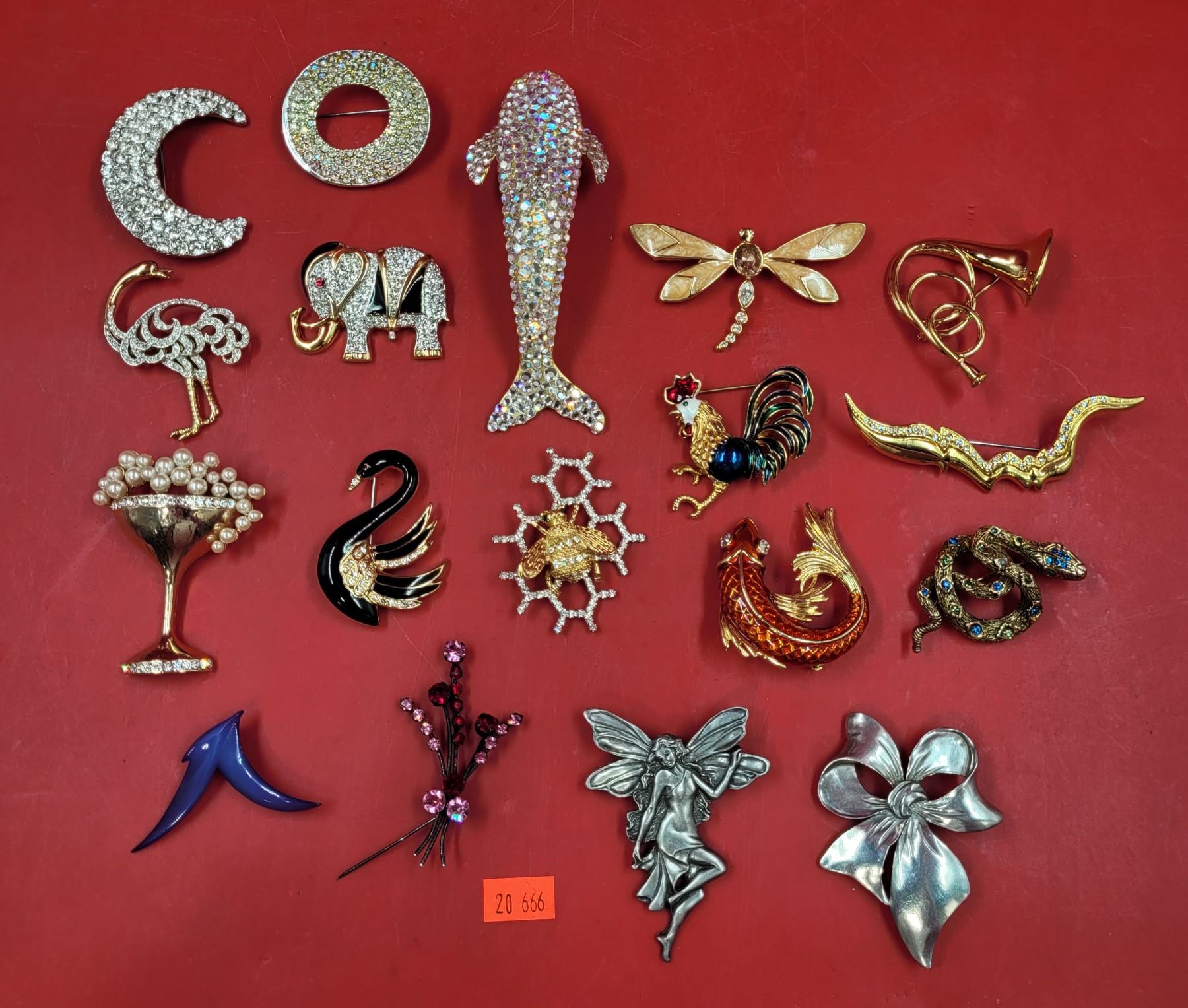 Assorted Brooch Lot w/ Honey Bee, Fairy, Koi Fish, Snake, Rooster, Martini, & More