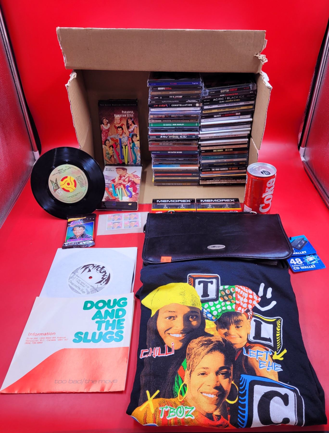 Assorted CDs, 2 45RPM Records, & TLC T-Shirt