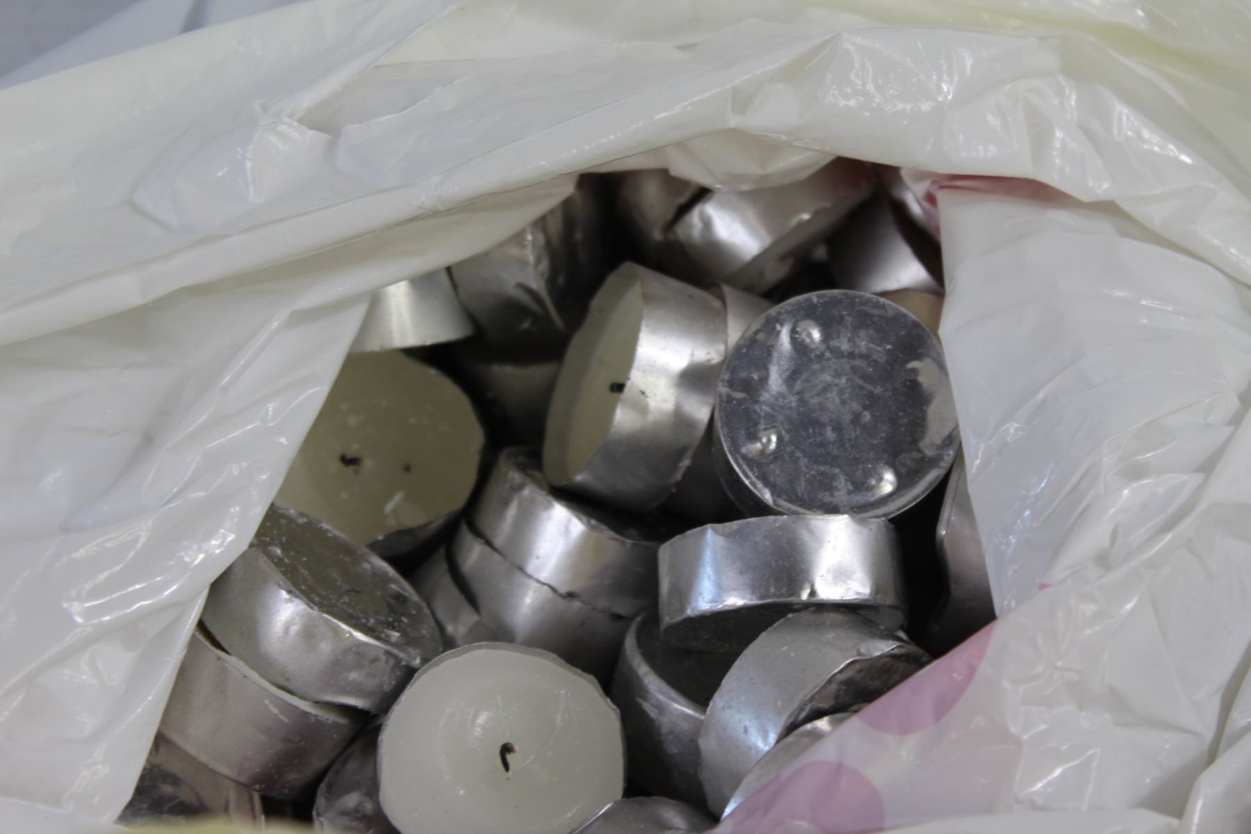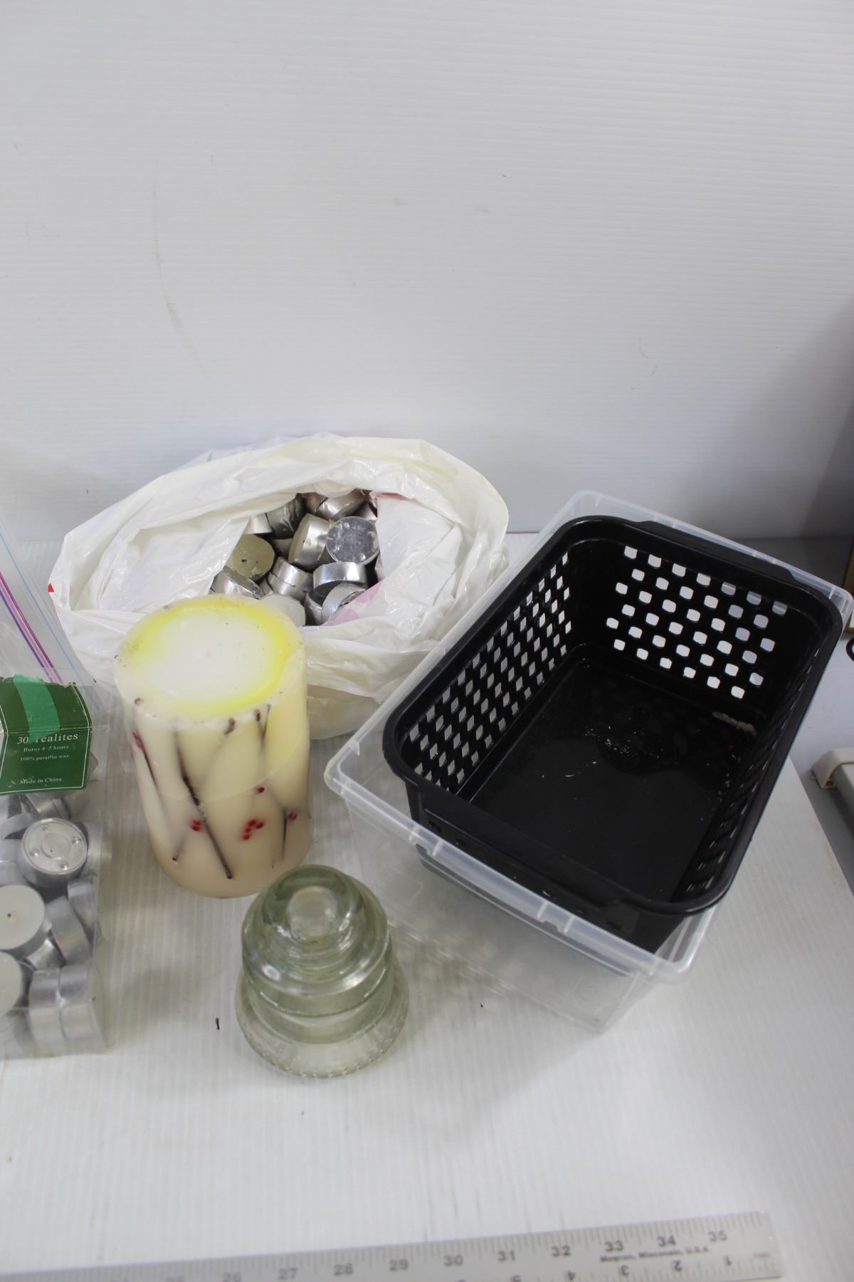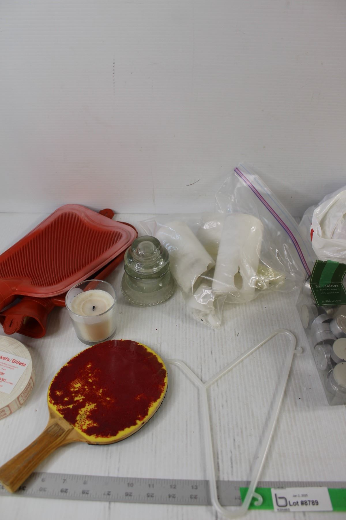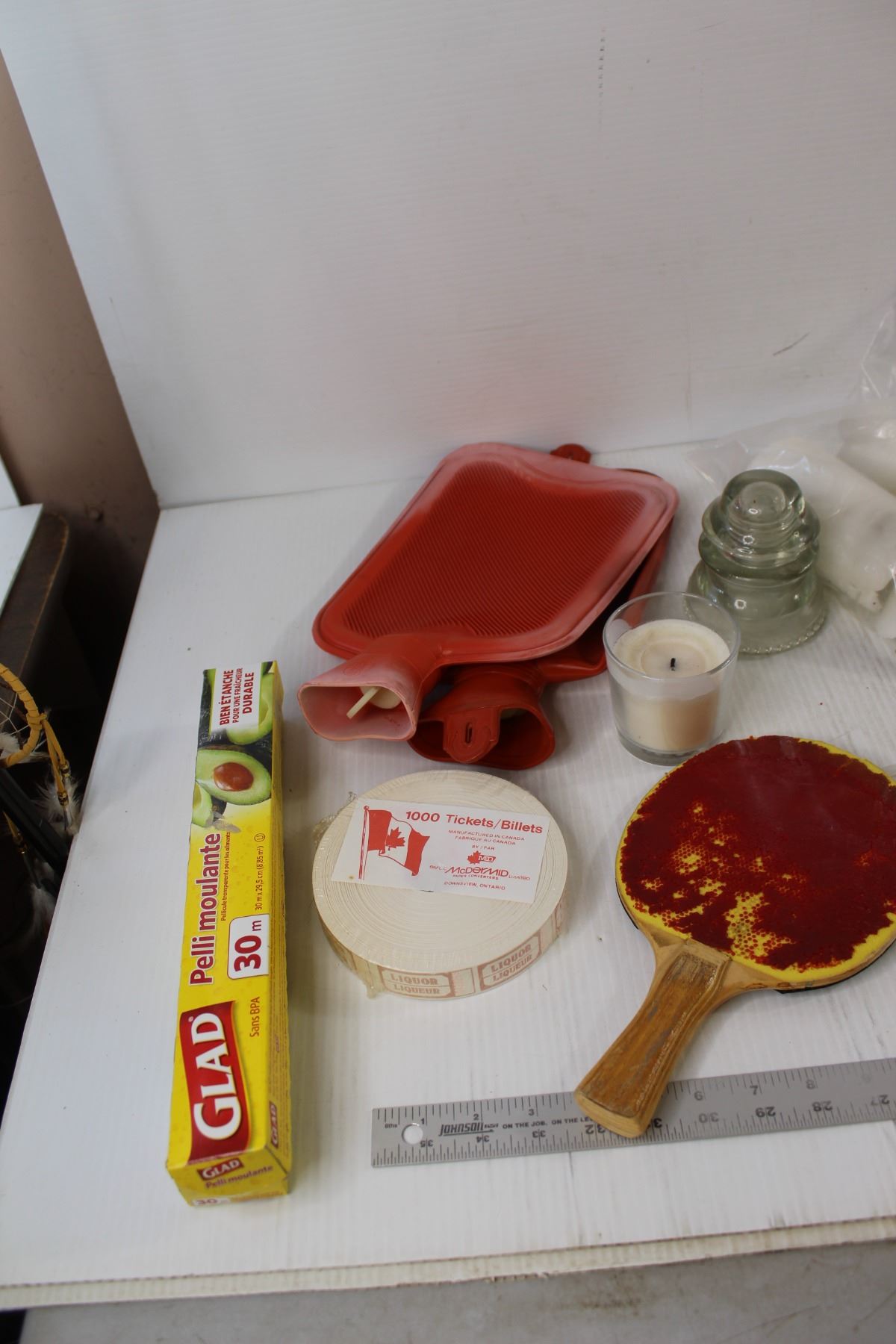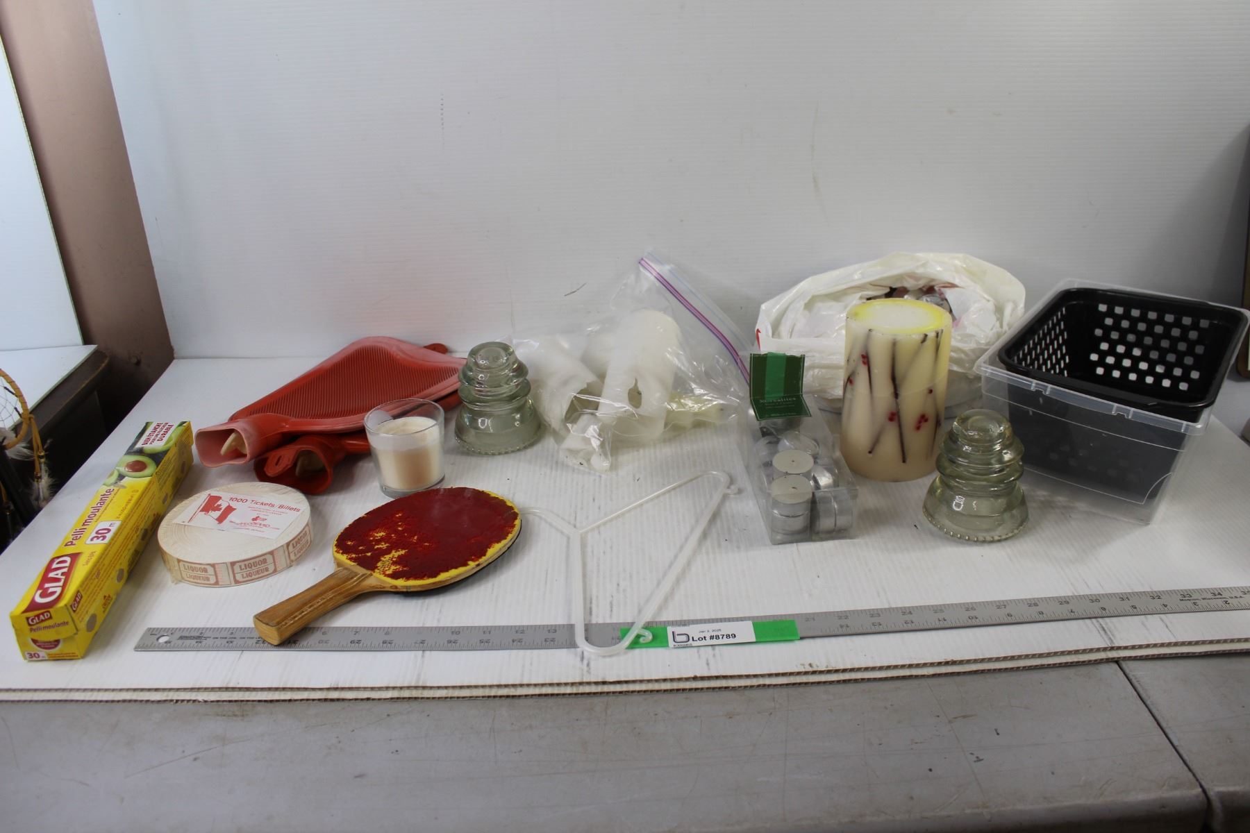 Assorted Candles, (2) Glass Insulators, Ping Pong Paddle, (2) Water Flasks, Cling Wrap