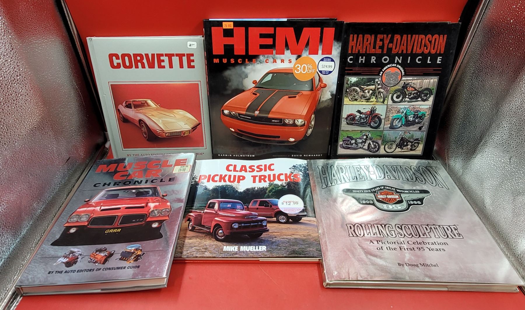 Assorted Car & Motorcycle Book Lot w/ Muscle Car Chronicle, Harley-Davidson Chronicle, & More
