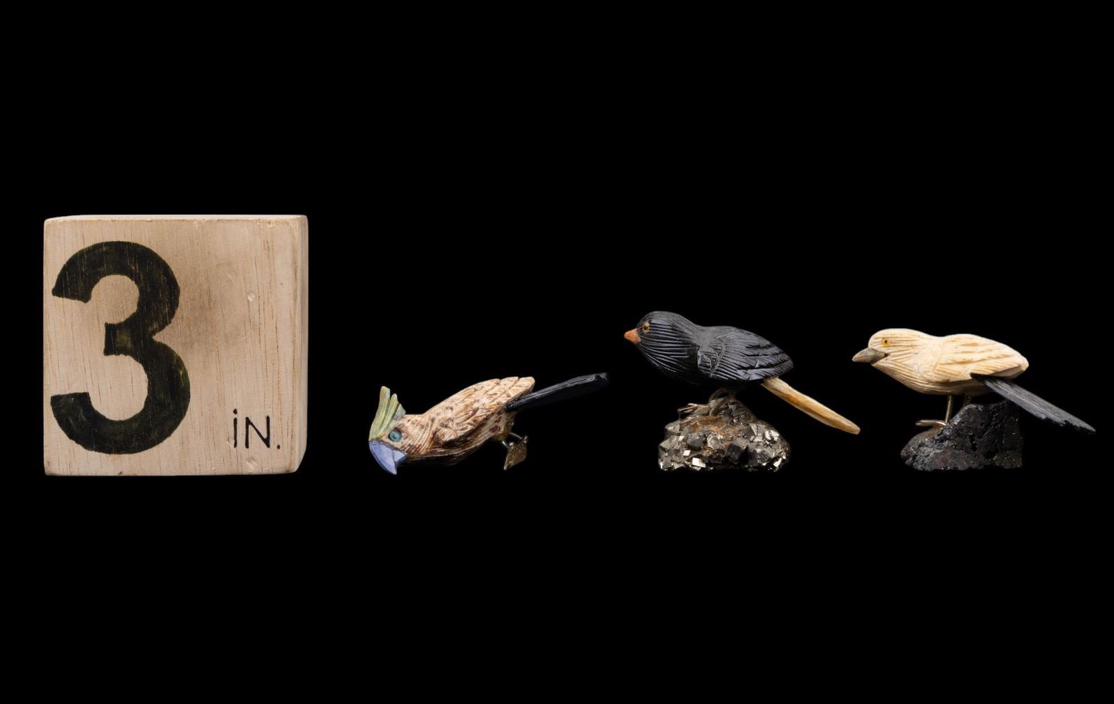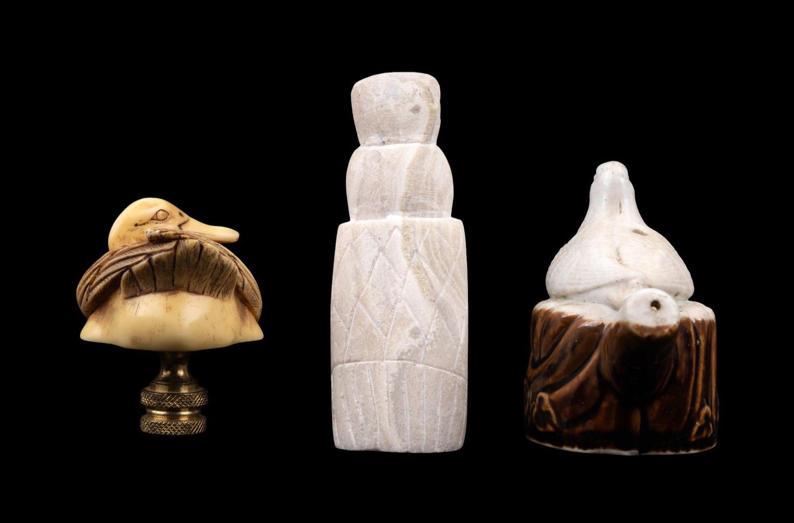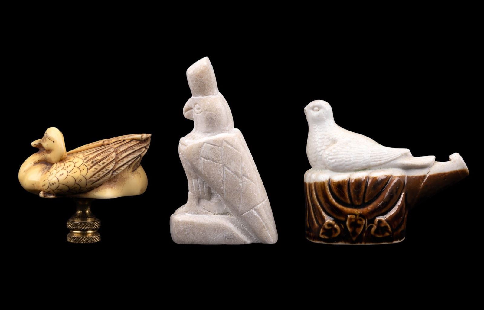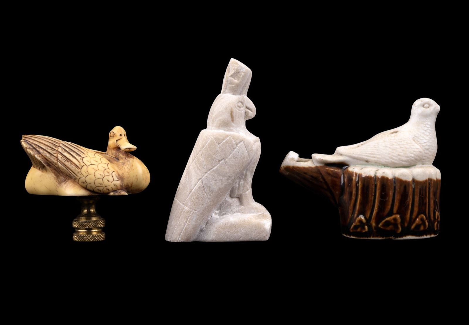 Collection features a pewter rhinoceros marked "Kirk Pewter" - measures approx. 3" L x 1.5" H, carved soapstone eagle, 3 hand carved birds (marked "Made in Peru") of natural materials with 2 mounted on hematite bases, dove ocarina (with beak loss), tea stained style resin duck finial, and more.