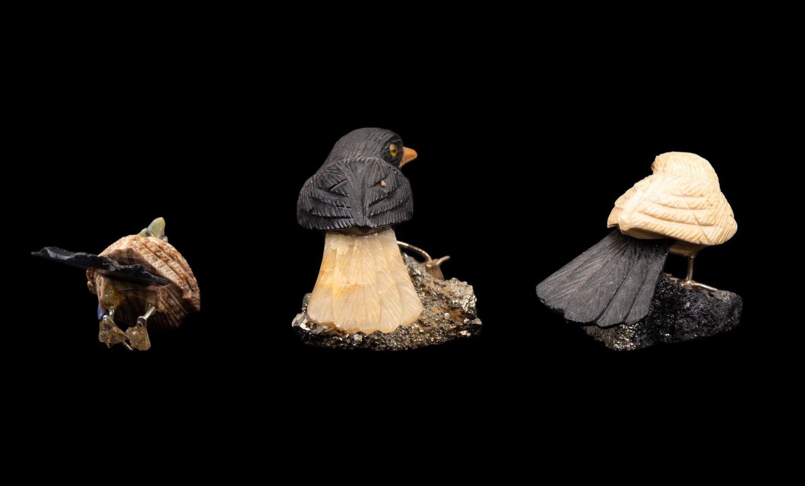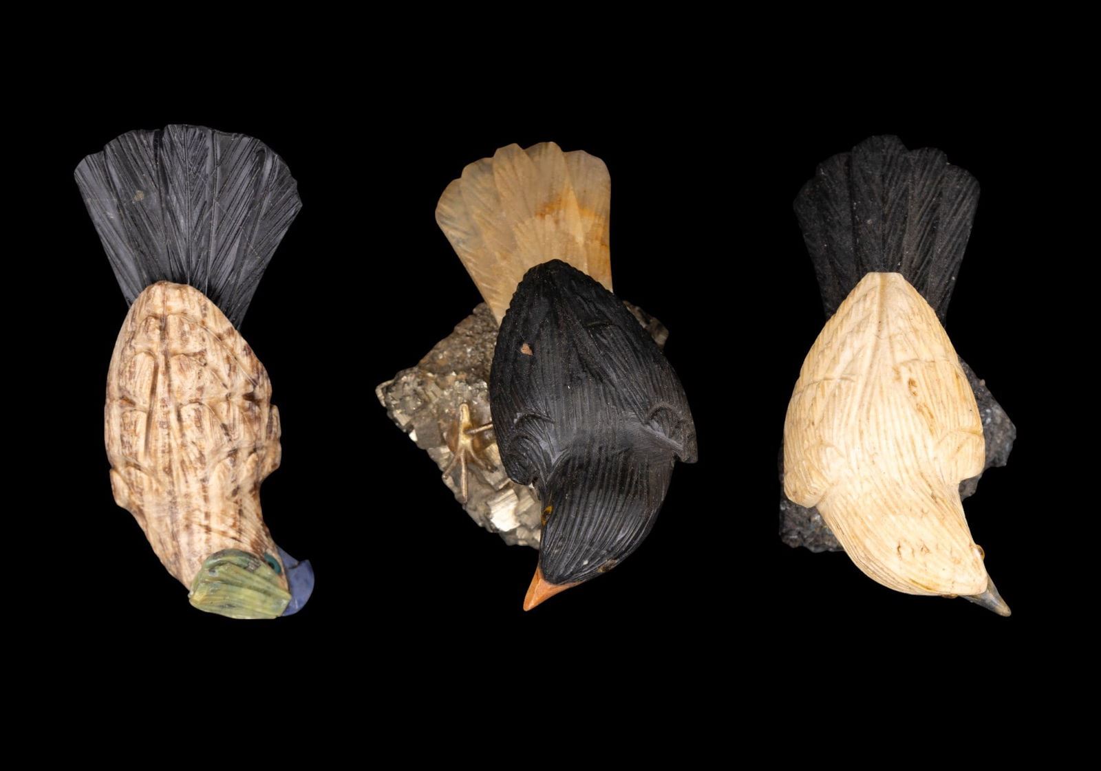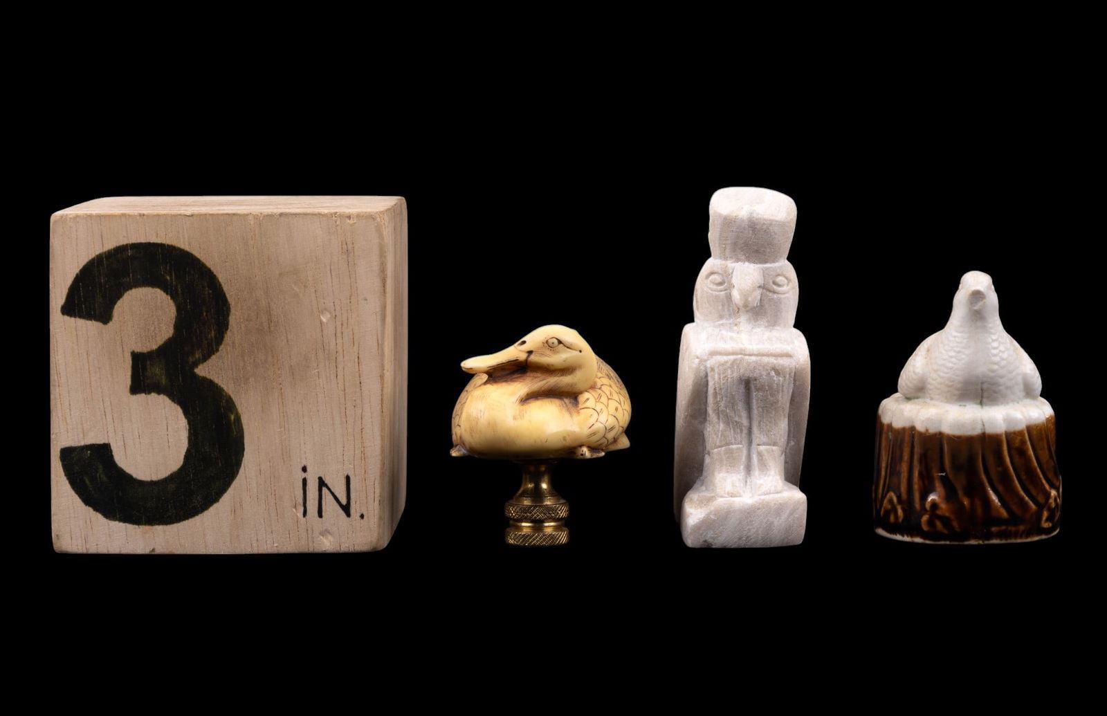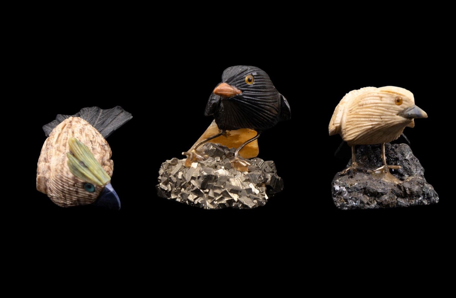 Collection features a pewter rhinoceros marked "Kirk Pewter" - measures approx. 3" L x 1.5" H, carved soapstone eagle, 3 hand carved birds (marked "Made in Peru") of natural materials with 2 mounted on hematite bases, dove ocarina (with beak loss), tea stained style resin duck finial, and more.