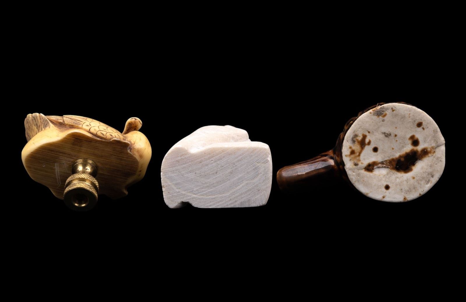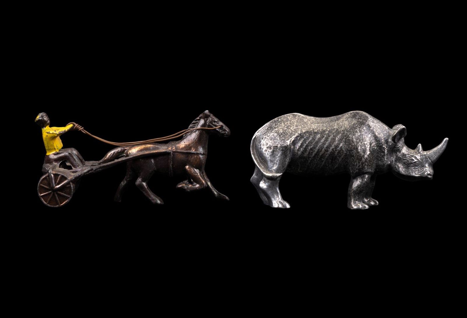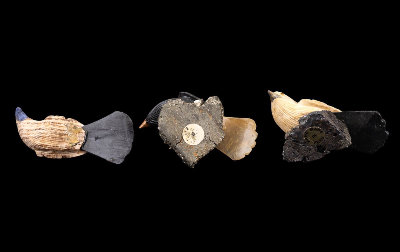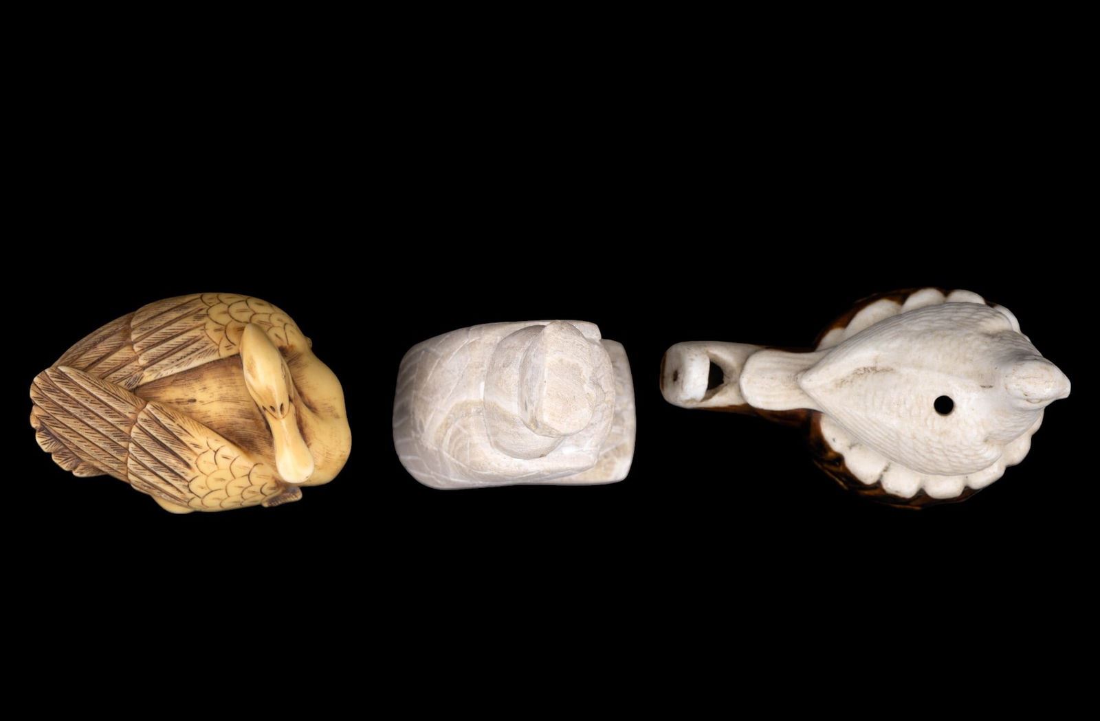 Collection features a pewter rhinoceros marked "Kirk Pewter" - measures approx. 3" L x 1.5" H, carved soapstone eagle, 3 hand carved birds (marked "Made in Peru") of natural materials with 2 mounted on hematite bases, dove ocarina (with beak loss), tea stained style resin duck finial, and more.