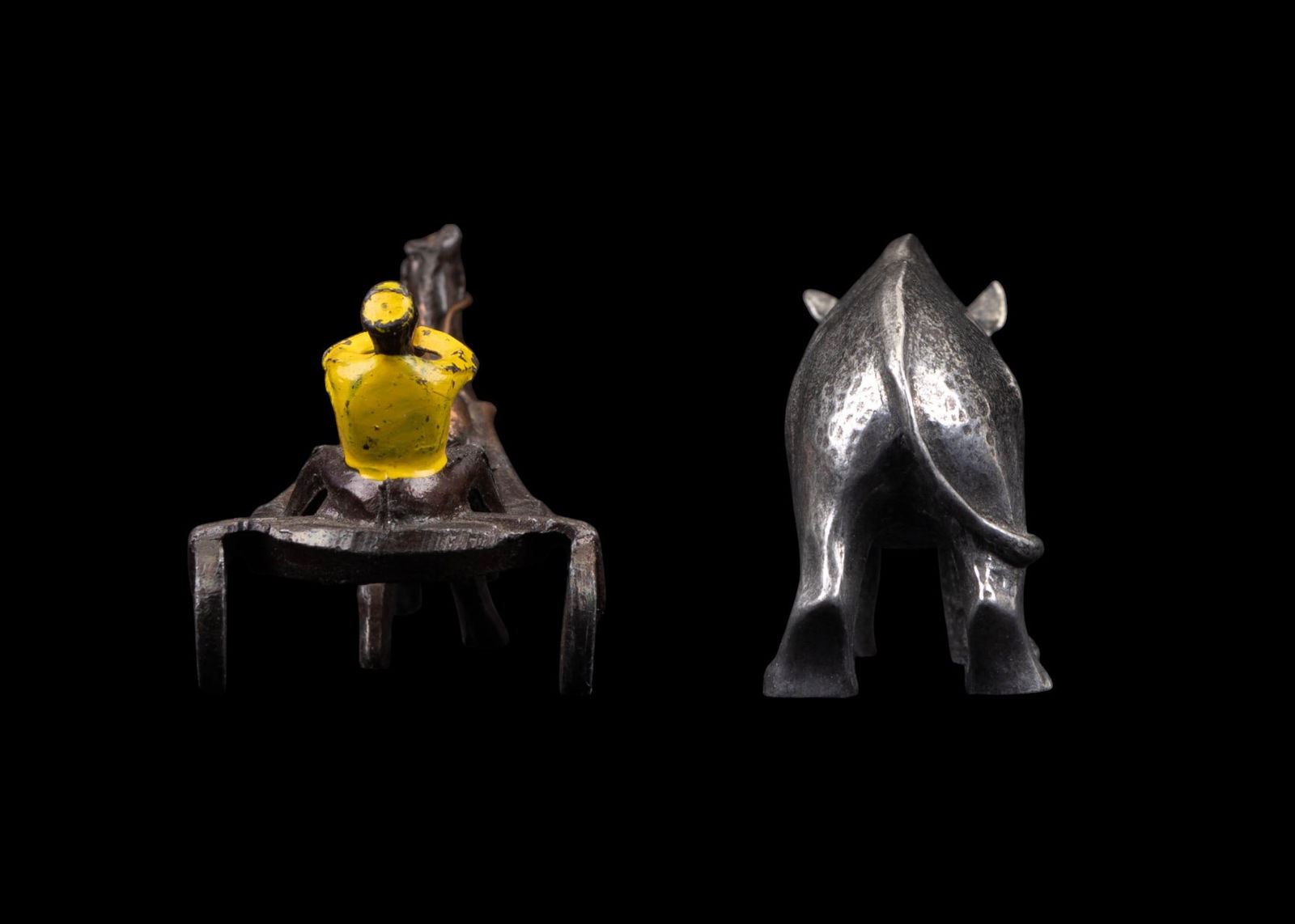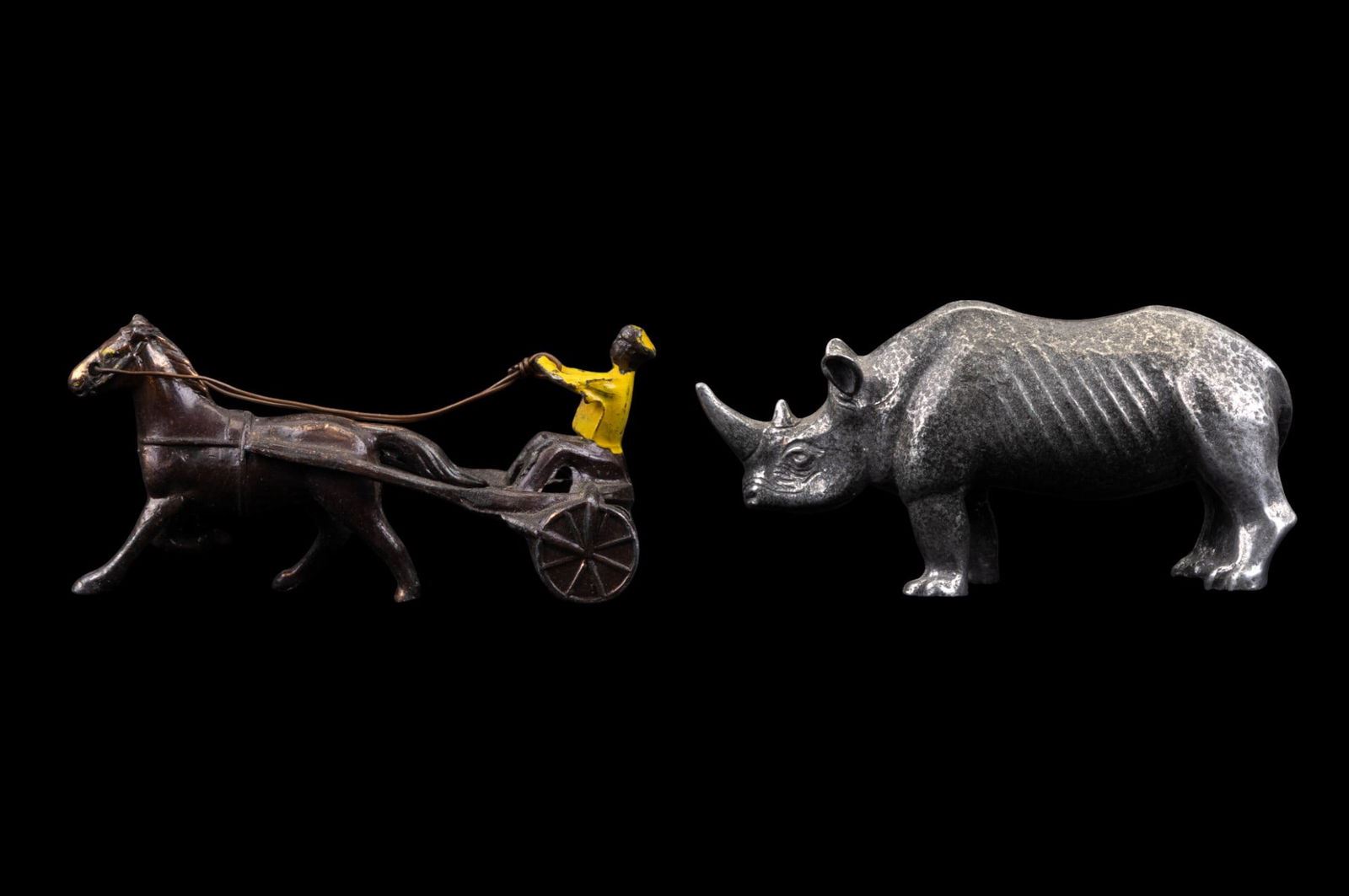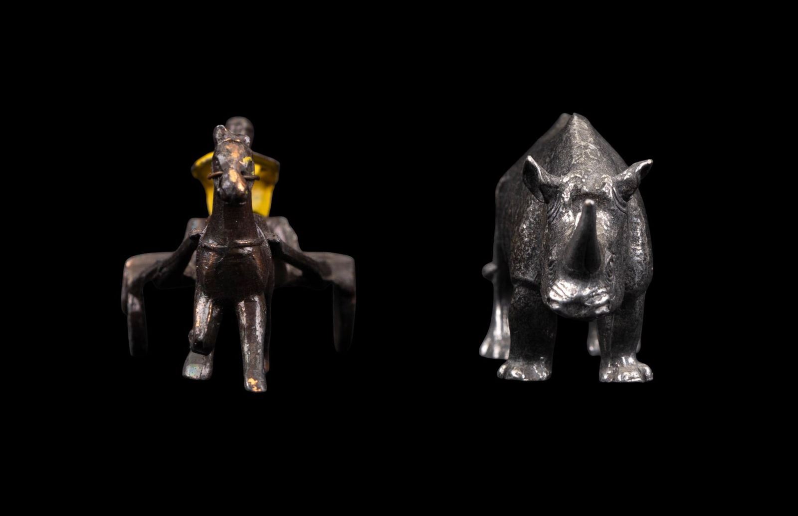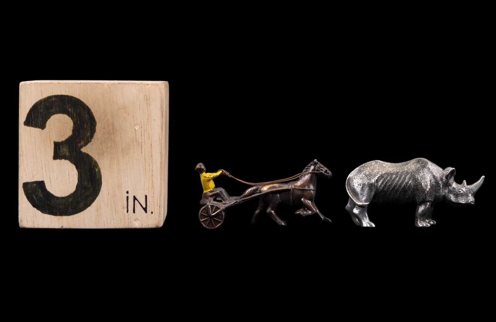 Collection features a pewter rhinoceros marked "Kirk Pewter" - measures approx. 3" L x 1.5" H, carved soapstone eagle, 3 hand carved birds (marked "Made in Peru") of natural materials with 2 mounted on hematite bases, dove ocarina (with beak loss), tea stained style resin duck finial, and more.