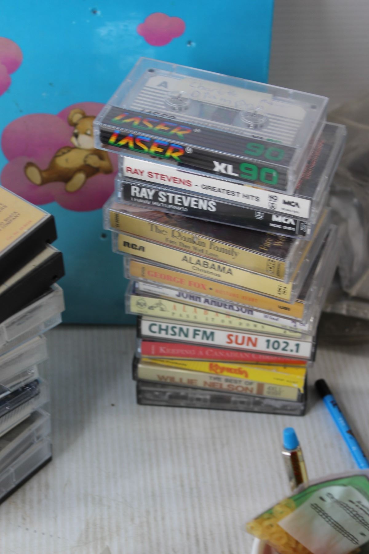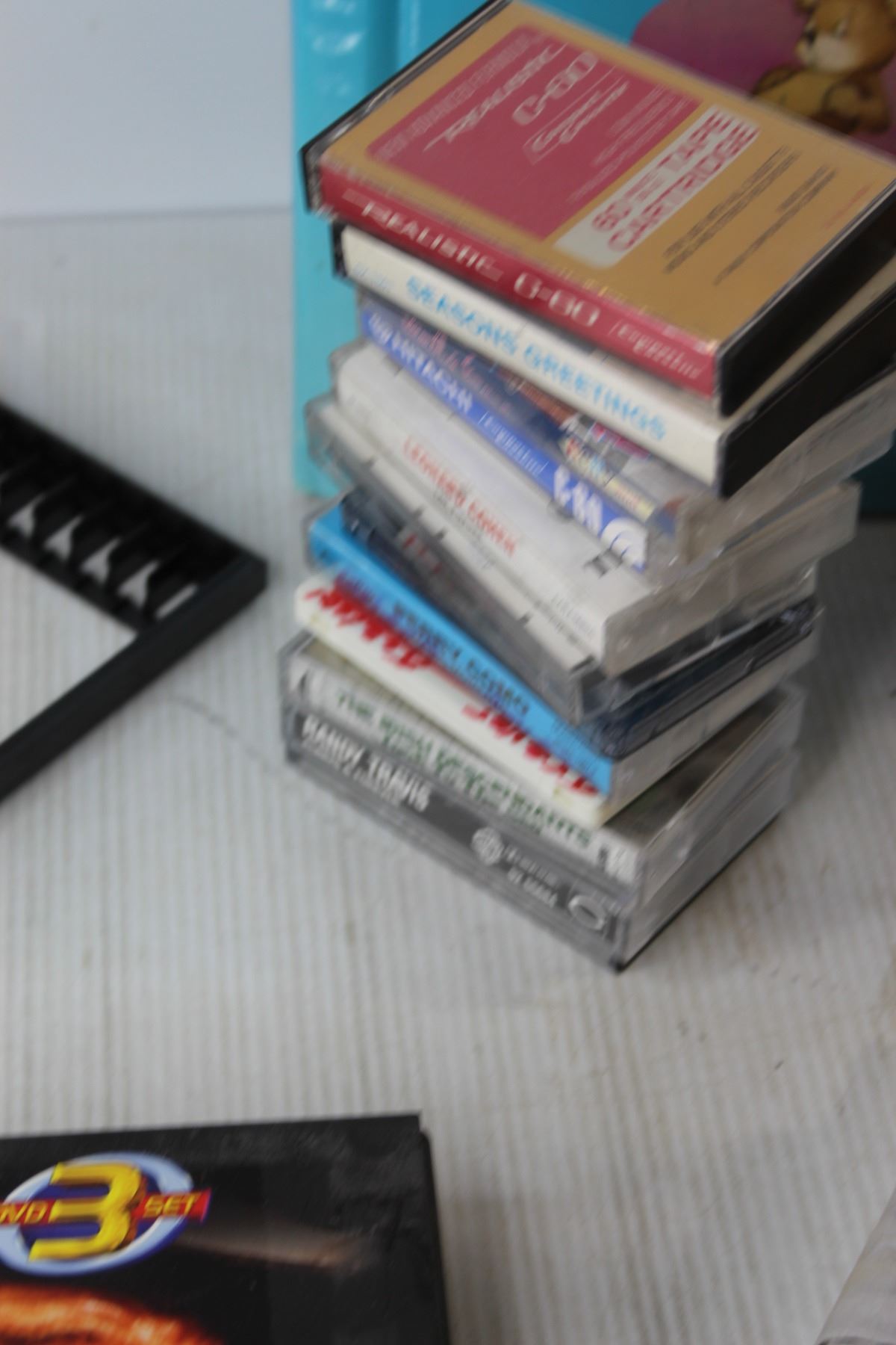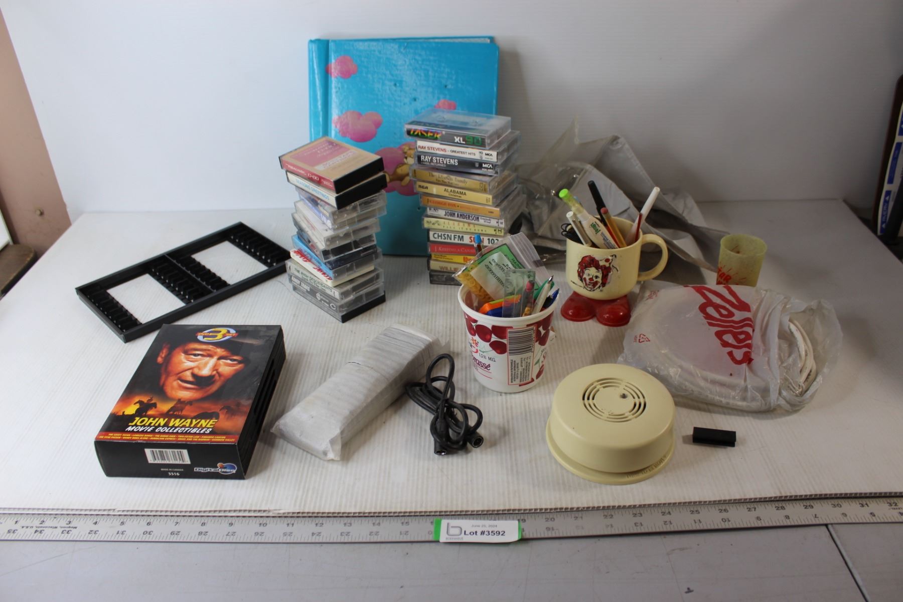 Assorted Cassettes, Pens, John Wayne DVD's, Smoke Detector, Misc.