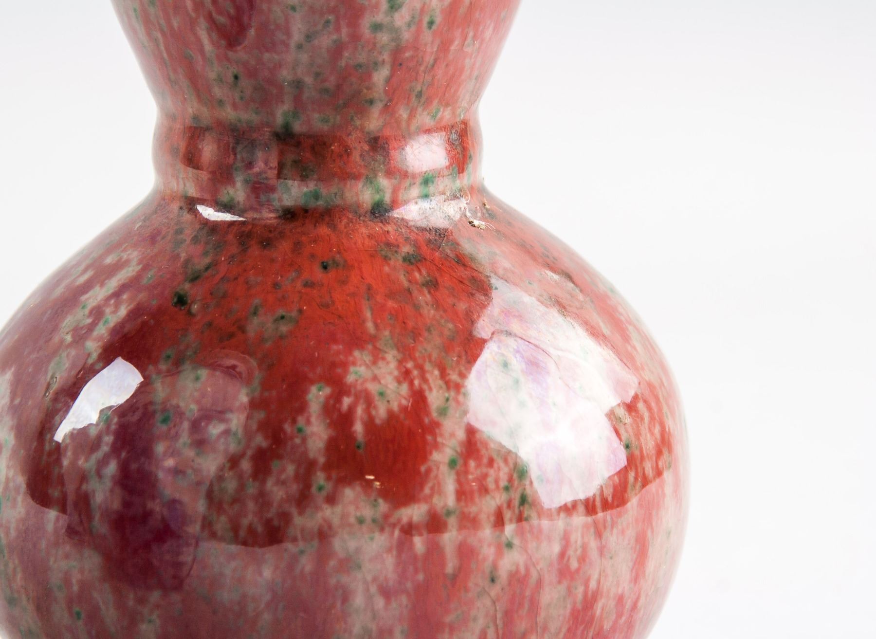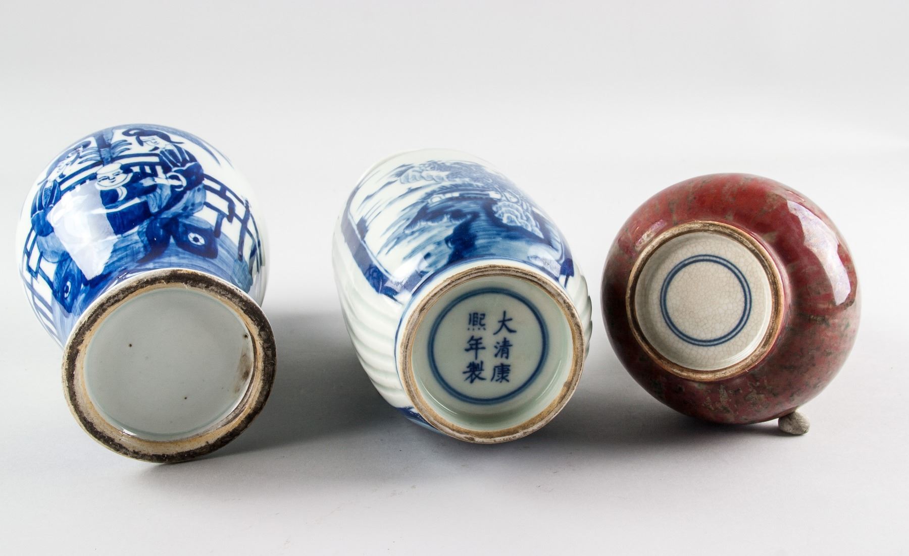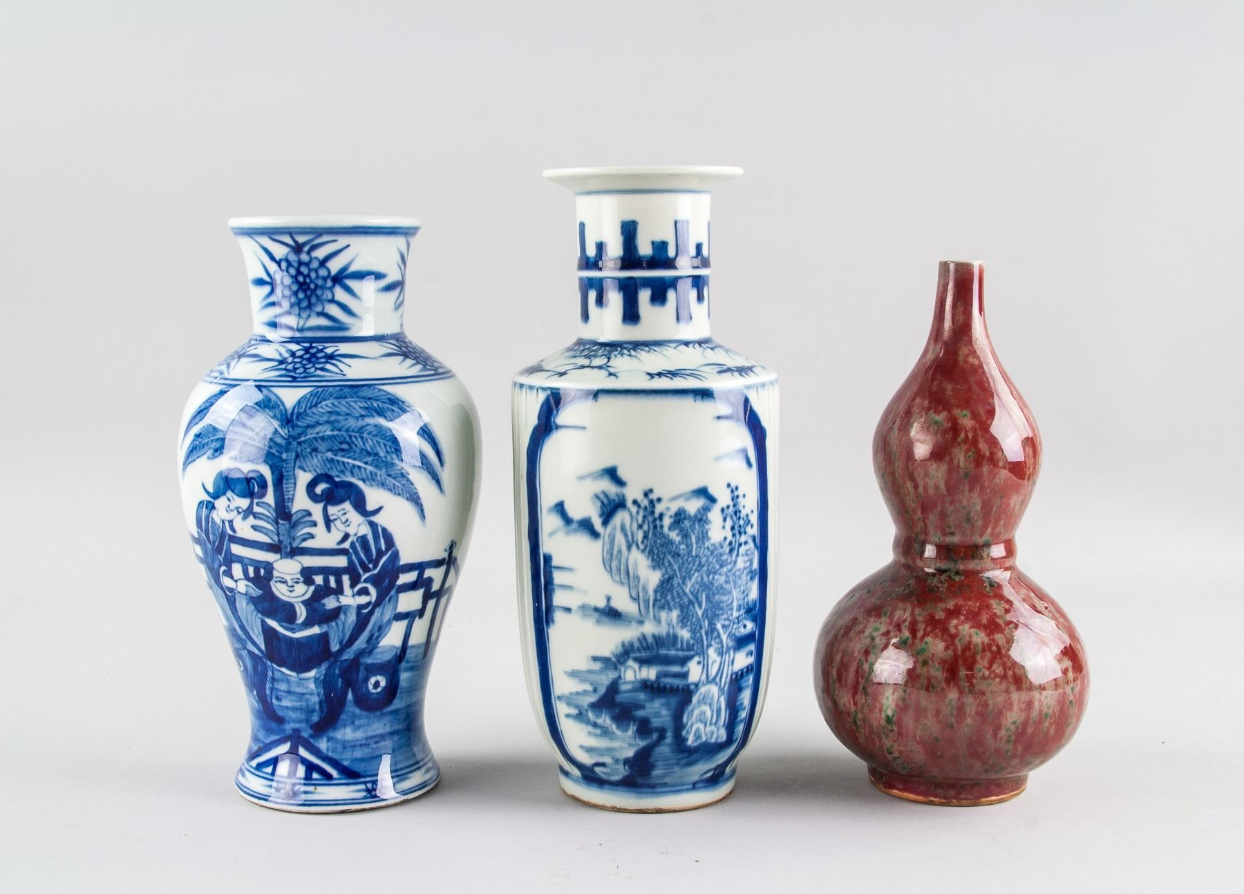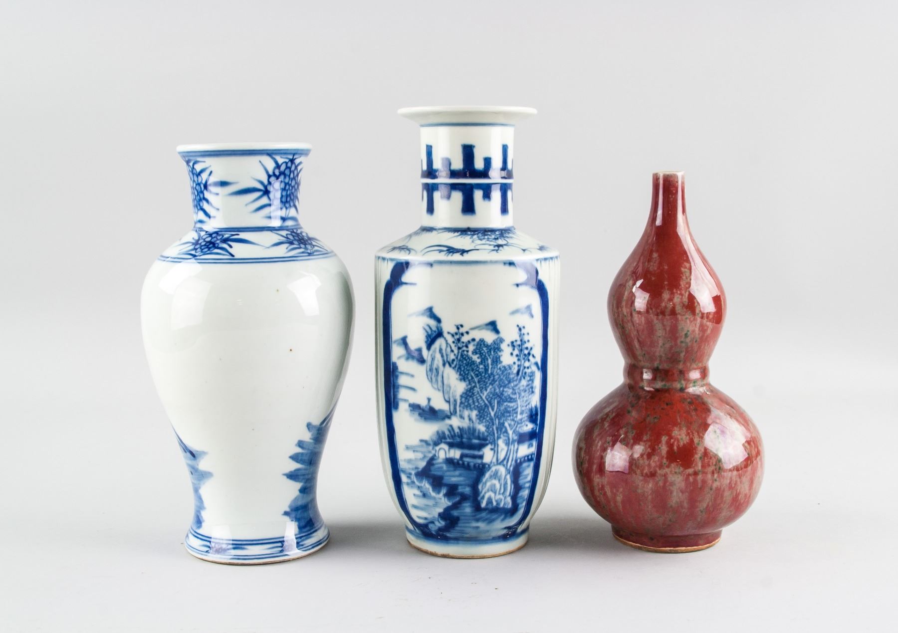 3 assorted Chinese porcelain vases, one of blue and white baluster form, painted with figures, one of blue and white cylinder form, painted with mountainous landscape, six-character Qing Kangxi mark on base, one of gourd form, covered by red flambe glaze, double ring mark on base, 1. 20 x 10.5 cm, 733 grams, 2. 21 x 10 cm, 513 grams, 3. 24 x 9.5 cm, 608 grams
