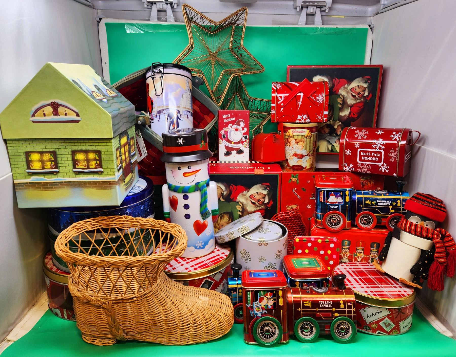 Assorted Christmas Cannisters & Decor w/ Snowman Tin, Train Tins, Santa's Boot Basket, & More