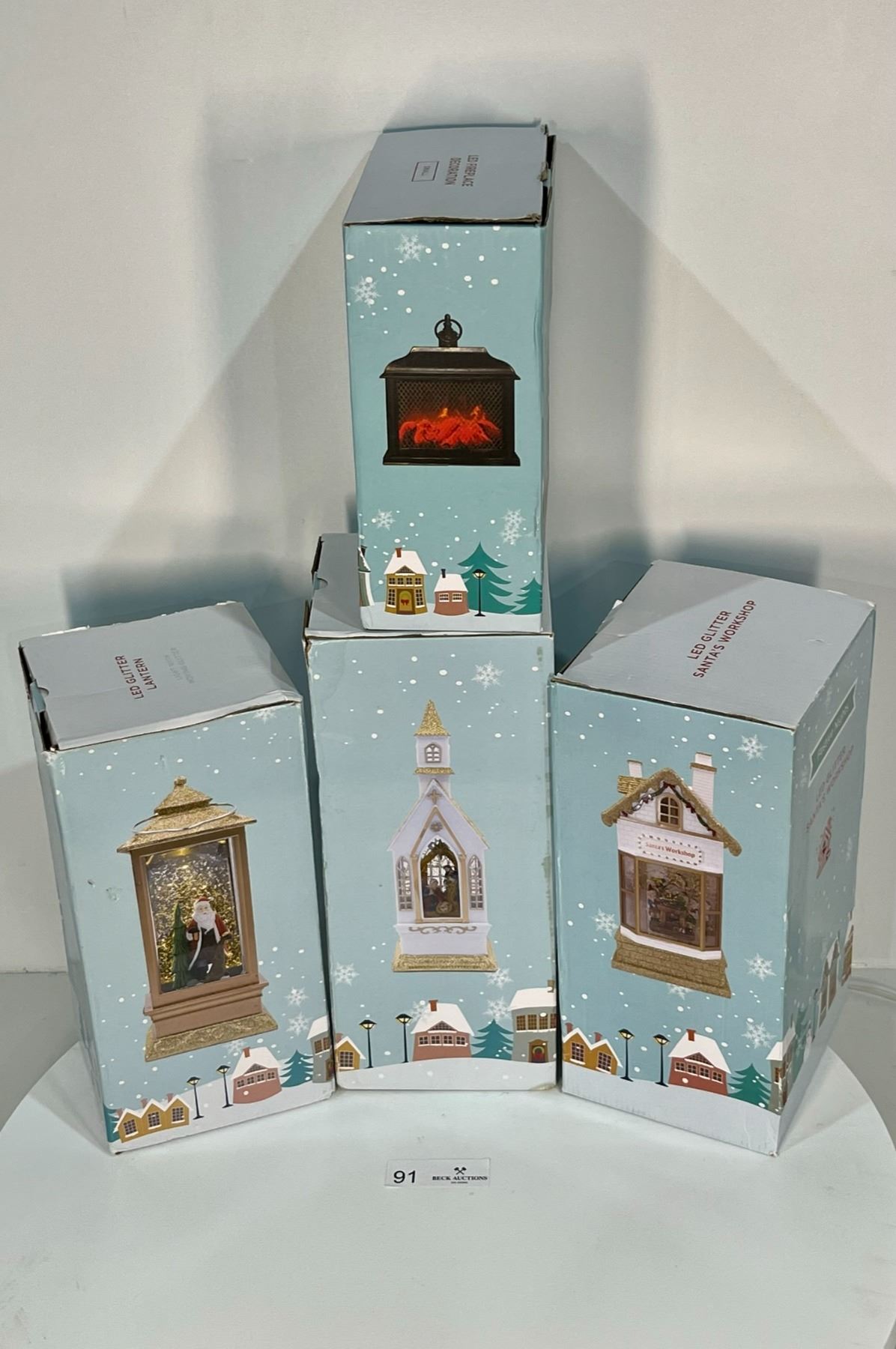 Miniature fireplace, Santa lantern, church, and Santa's workshop.