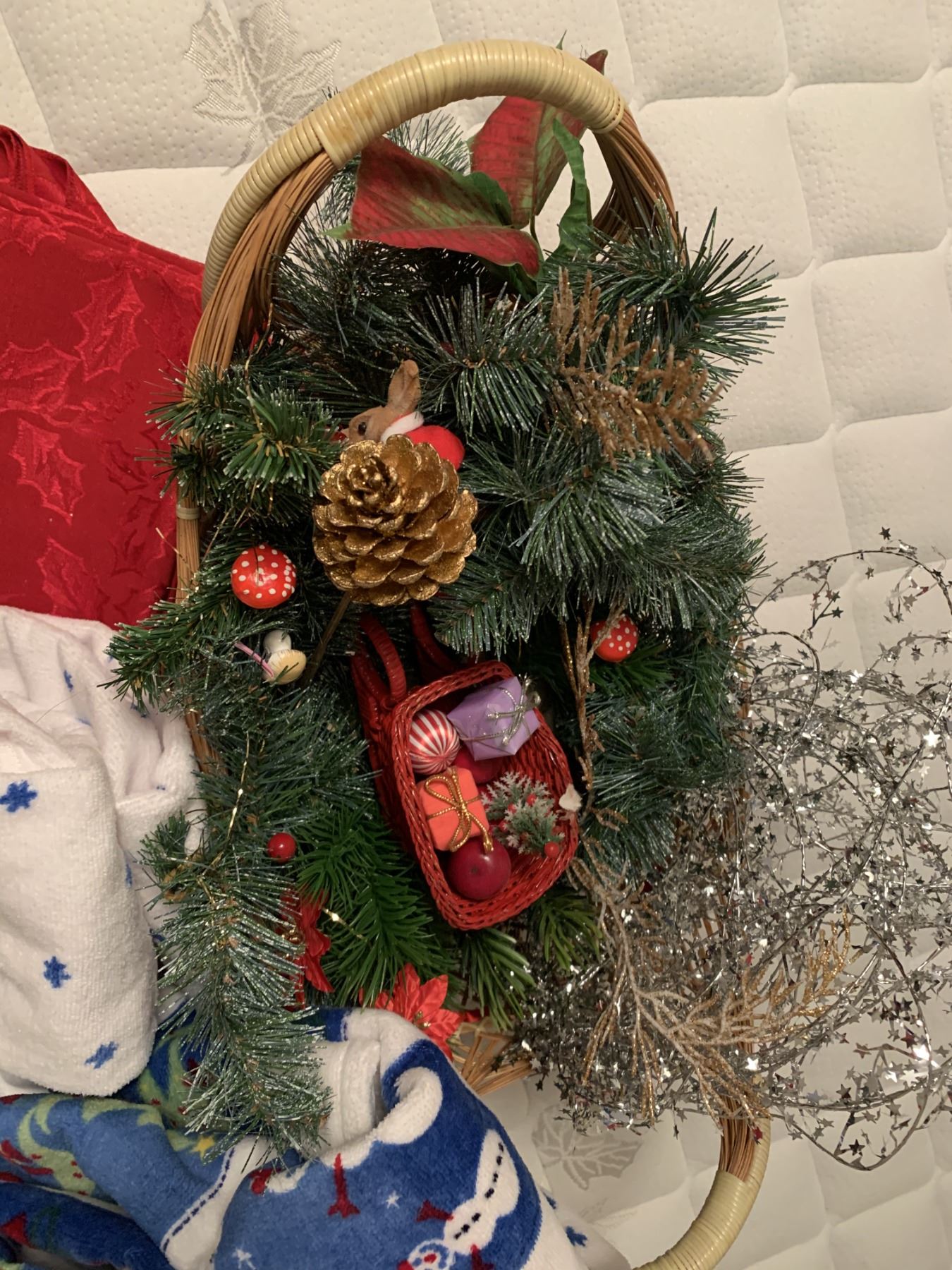 Basket full of artificial pine pieces, 1x small red dove ornament, and more!