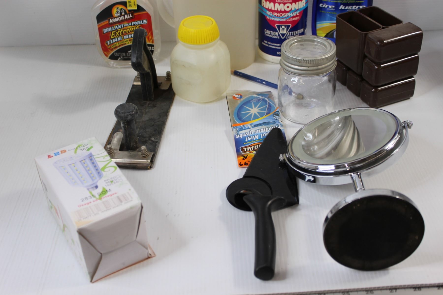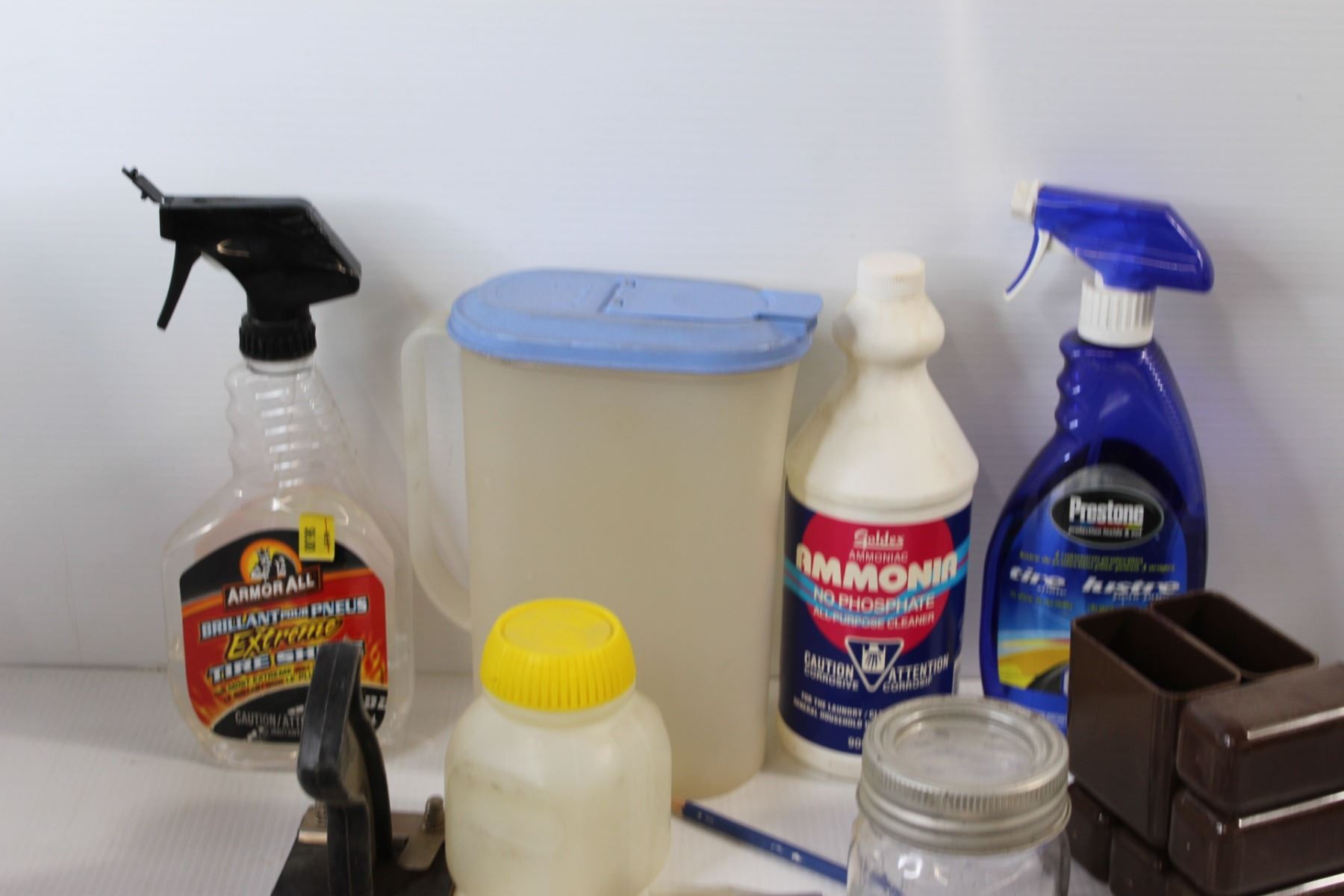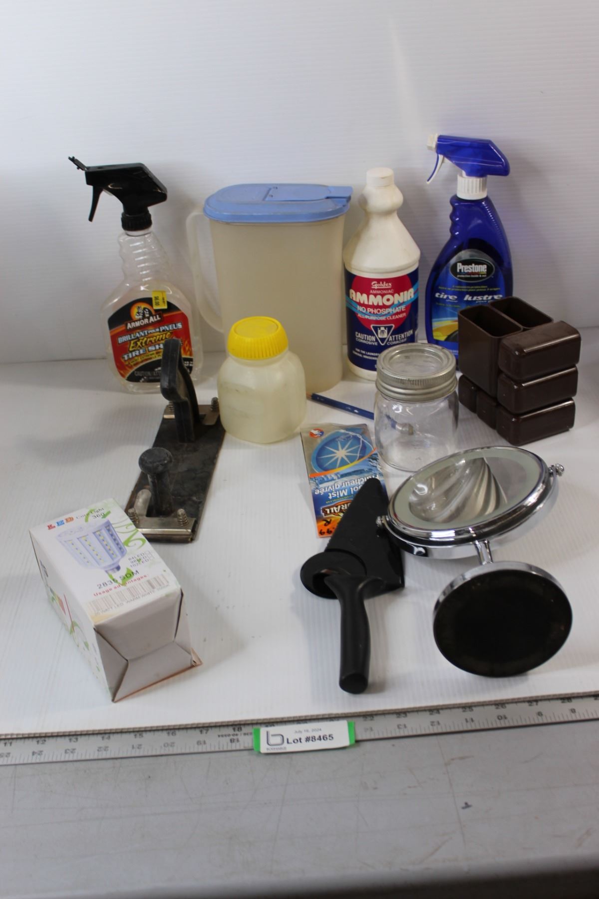 Assorted Cleaning Liquids, Hand Sander, Pizza Cutter, Misc.