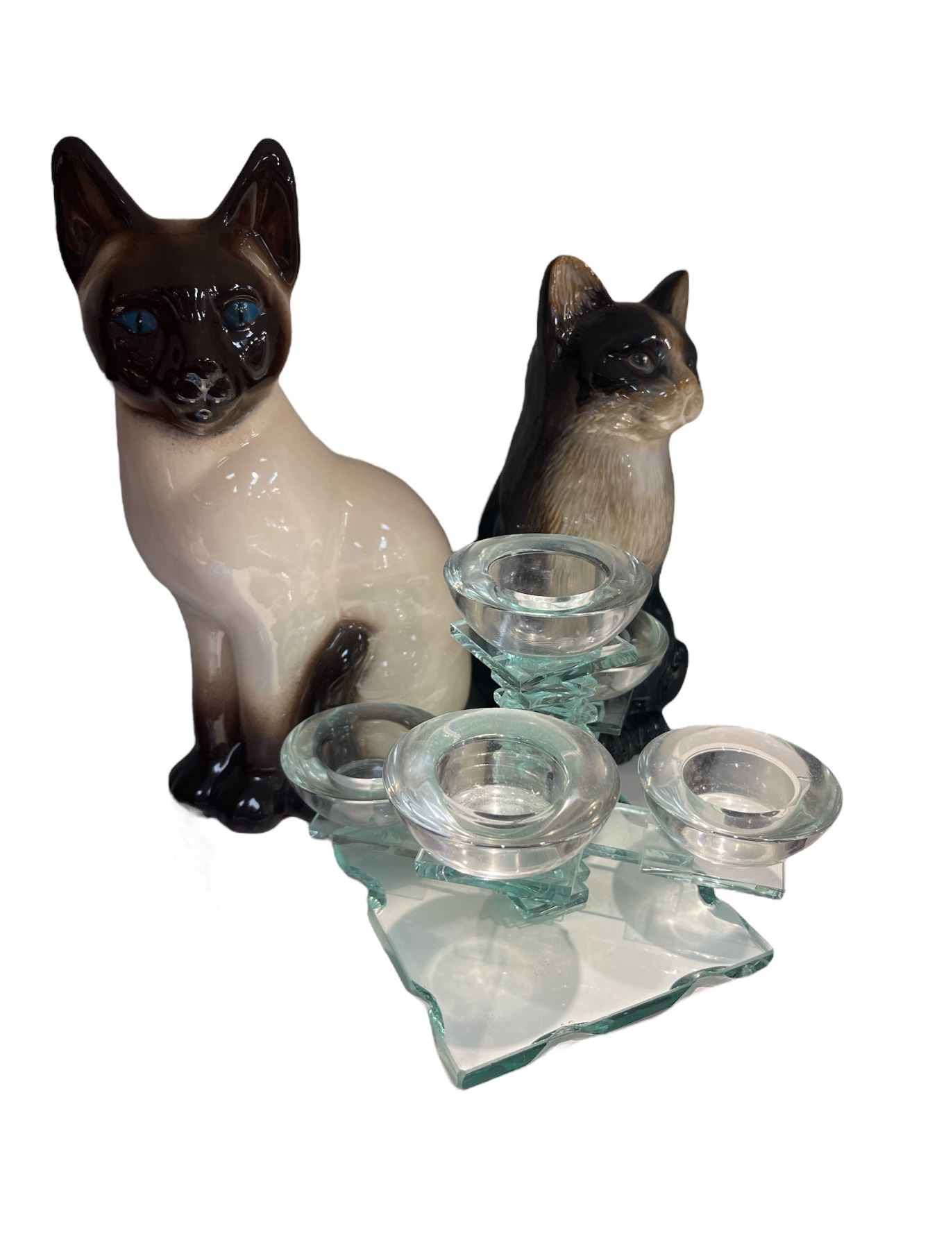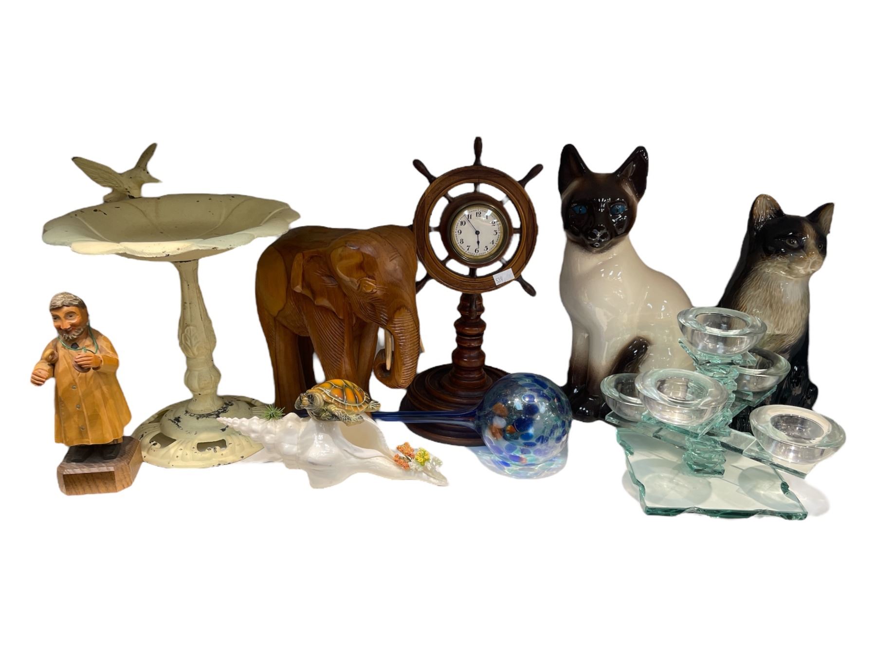 Assorted Collectibles, Ceramic Cats, Captain Wheels Clock, Cast Iron Bird Feeder, Etc..
