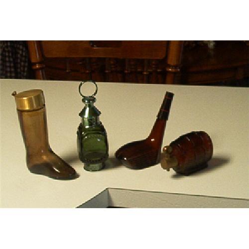 Featuring an assortment of vintage, figural collection of Men's Avon Bottles. The first one is in the shape of a Lantern (Whale Oil Lantern), forest green in color: the second figural bottle is an amber glass beer keg with gold tone opening. The third bottle is an amber colored glass boot with a gold toned lid. The fourth bottle is a dark amber glass golf club. All four bottles are in excellent condition.