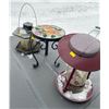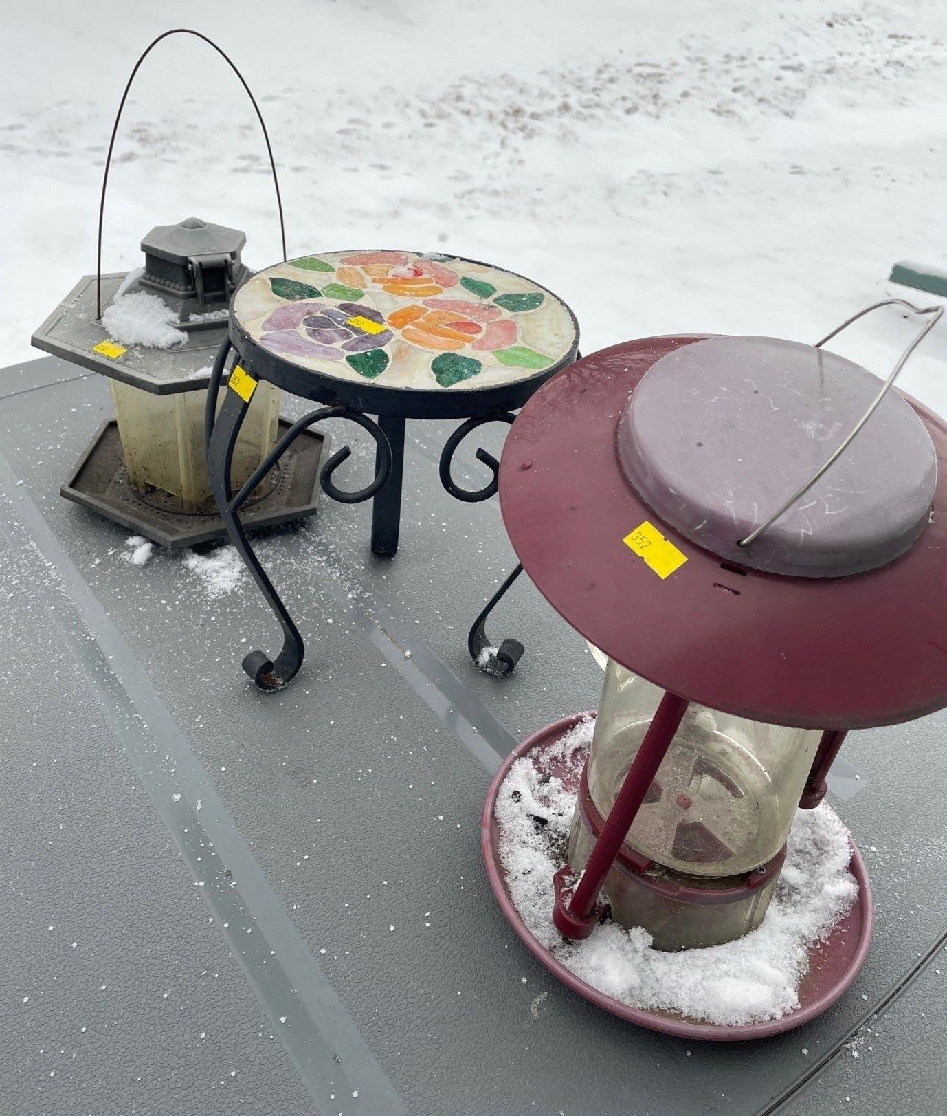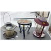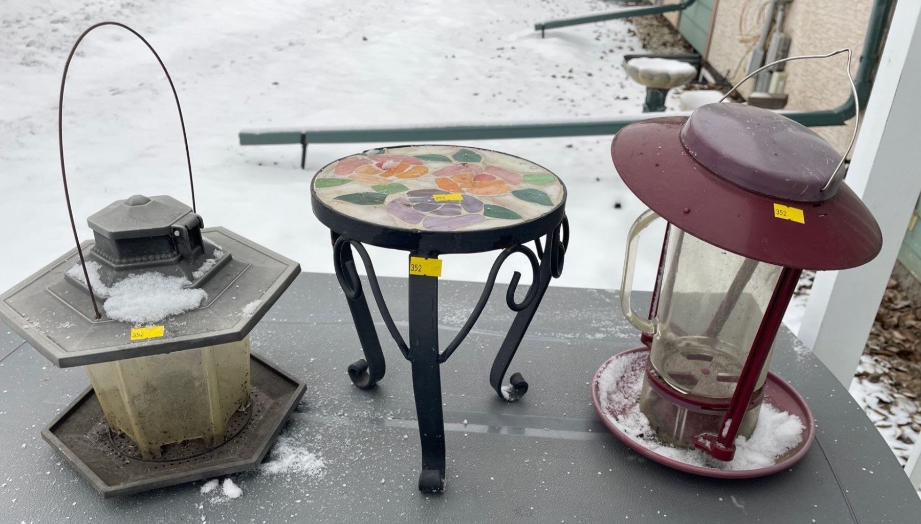 Assorted Collection Of Outside Patio Decor - Rod Iron Table, & Lanterns