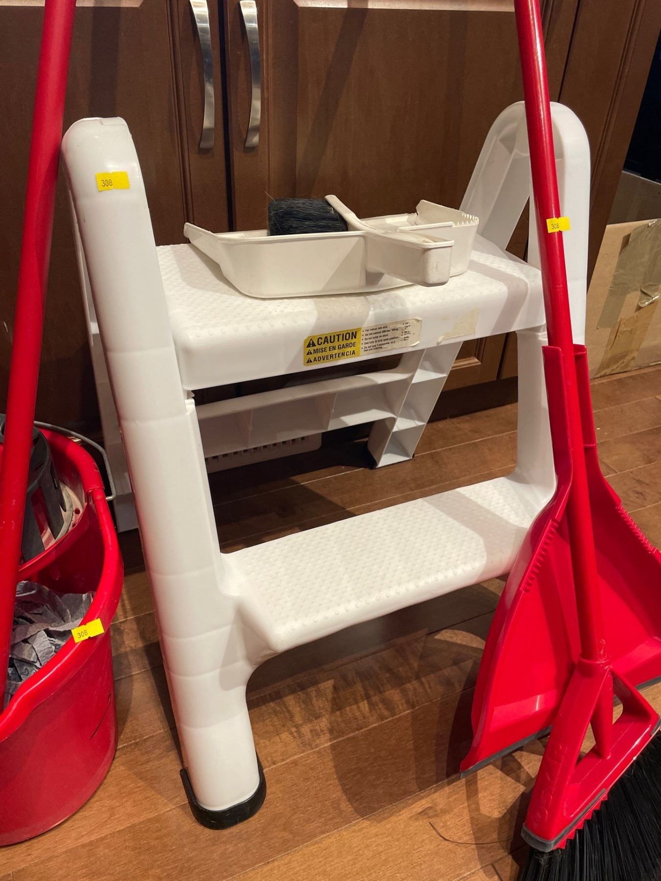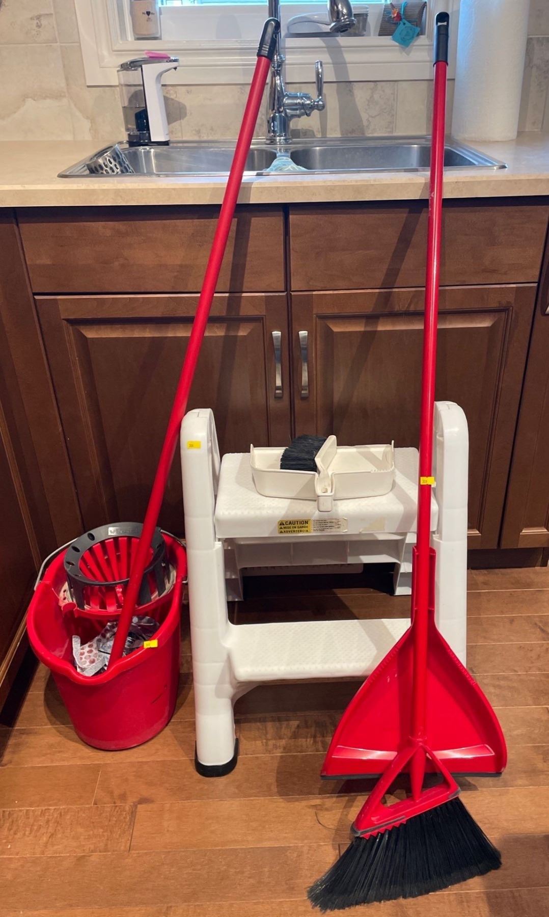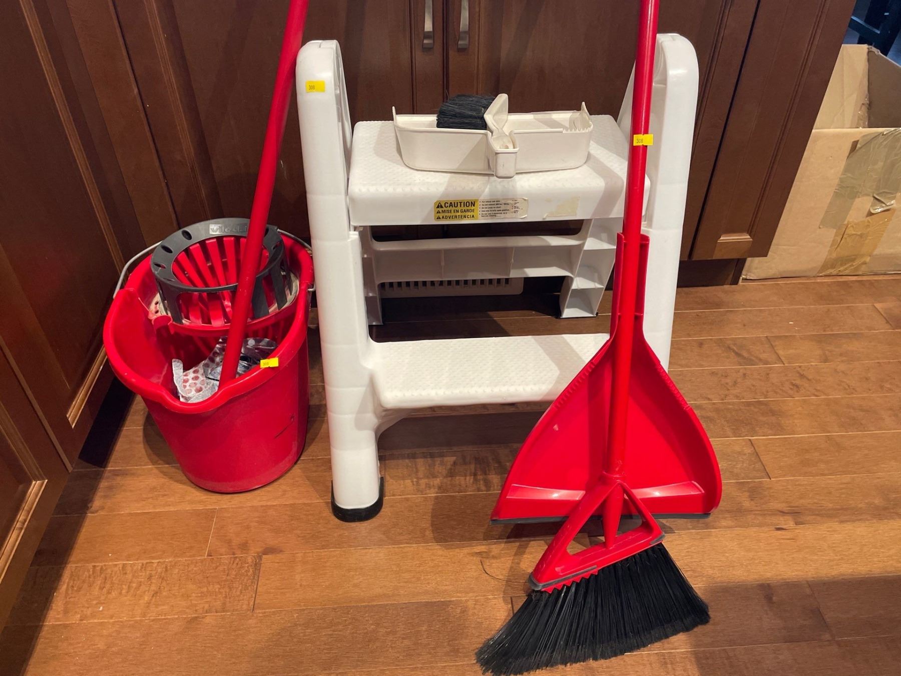 Assorted Collection of Cleaning Items and 2 Step Ladder - Brooms, Dustpans, Mop Bucket & More