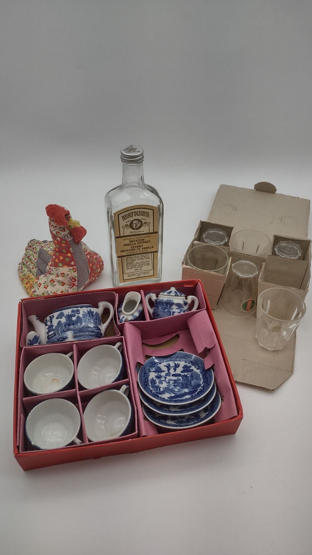Watkins glass "vanilla" bottle, Rooster stuffy, vintage, childrens ceramic teaset, Box of 6 Duralex glass cups
