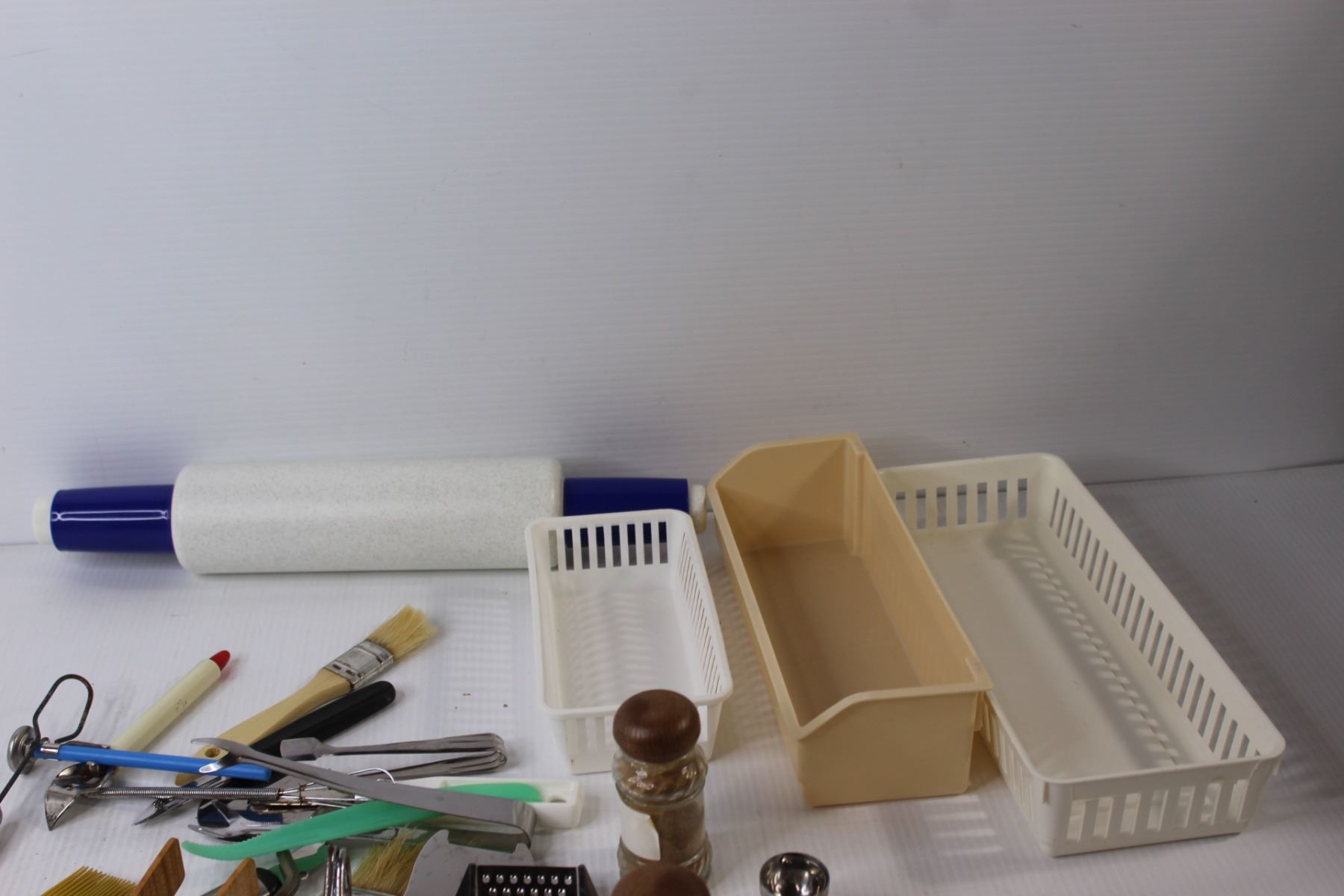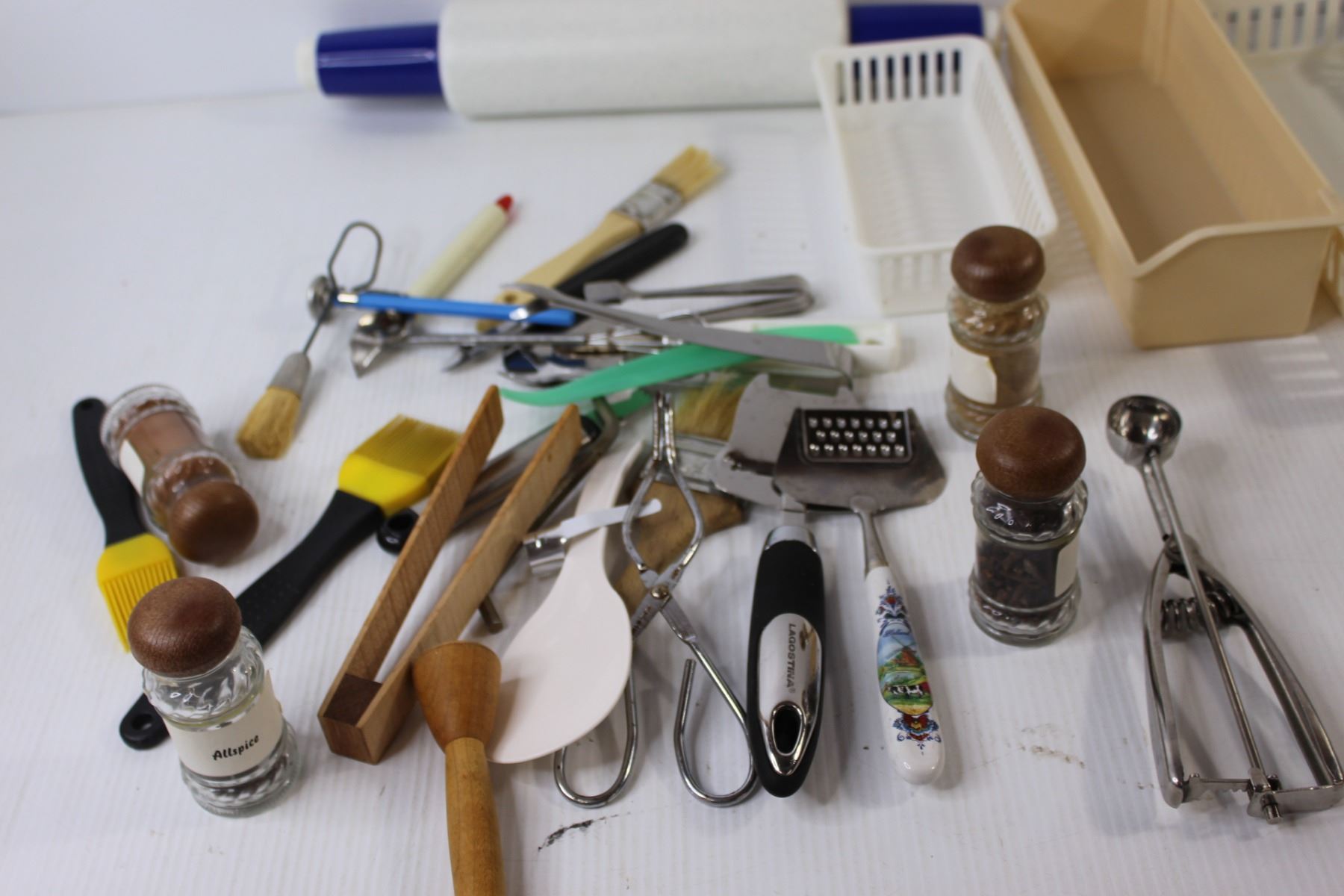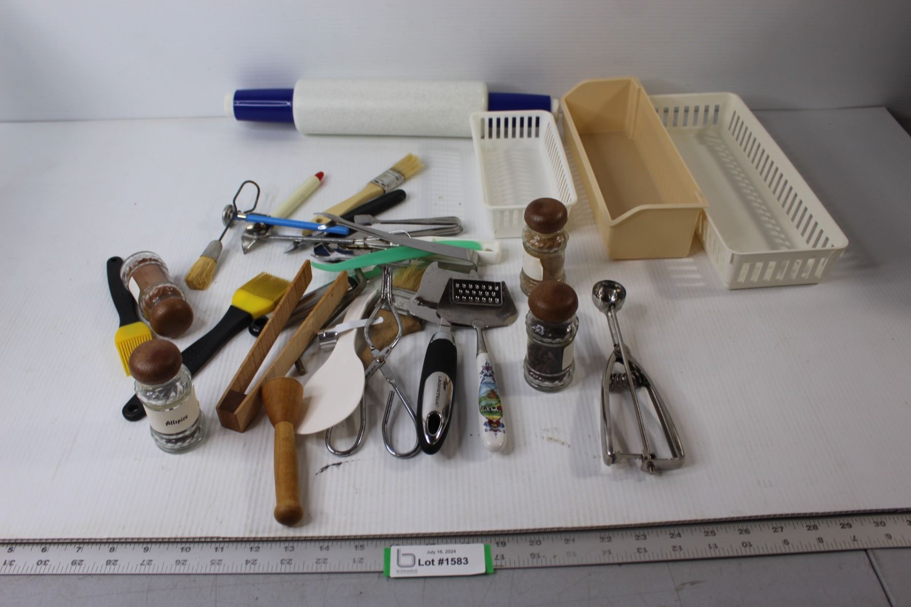 Assorted Cooking Utensils, Containers, Spices, Rolling Pin, Misc.