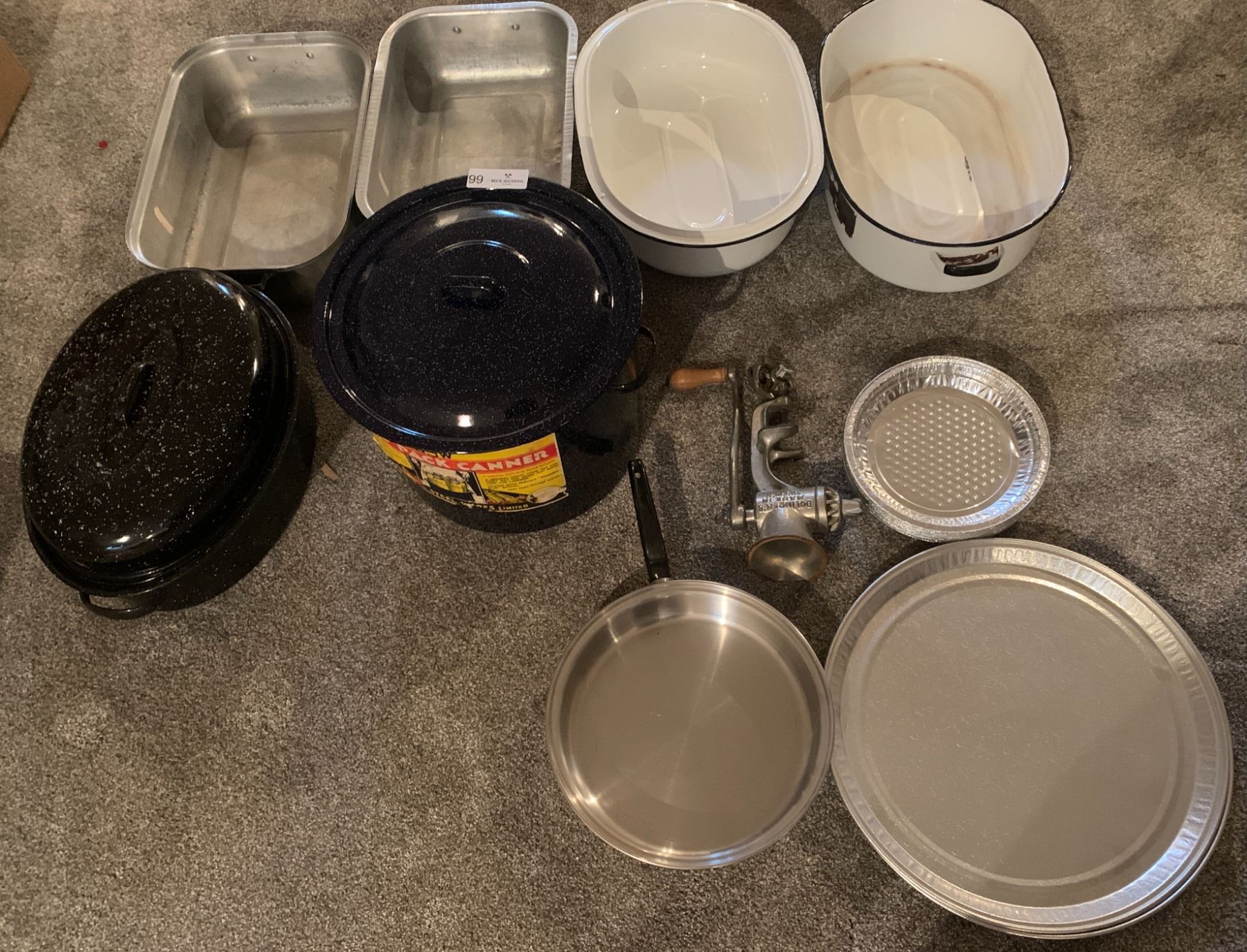 Including Roasters, Large Pot, Vintage Meat Grinder, Skillet, & Disposable Almuinum Trays