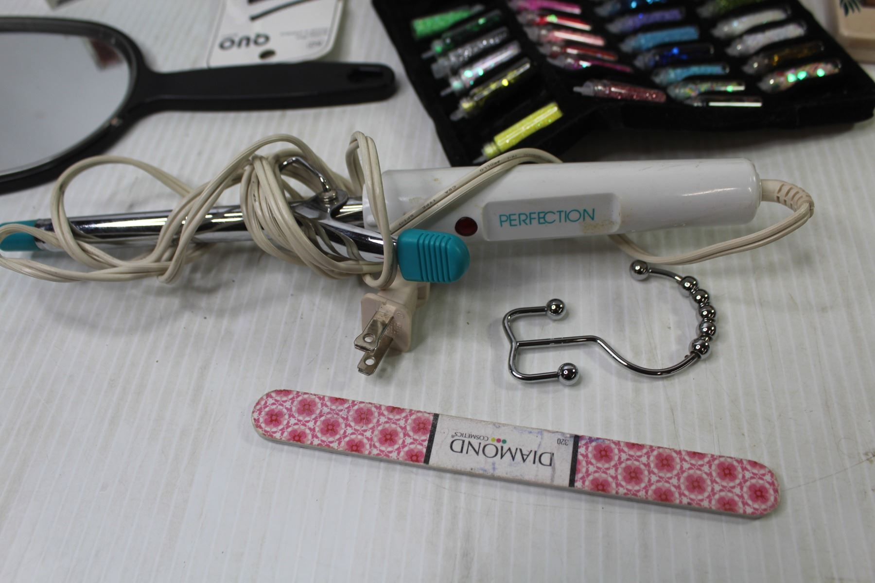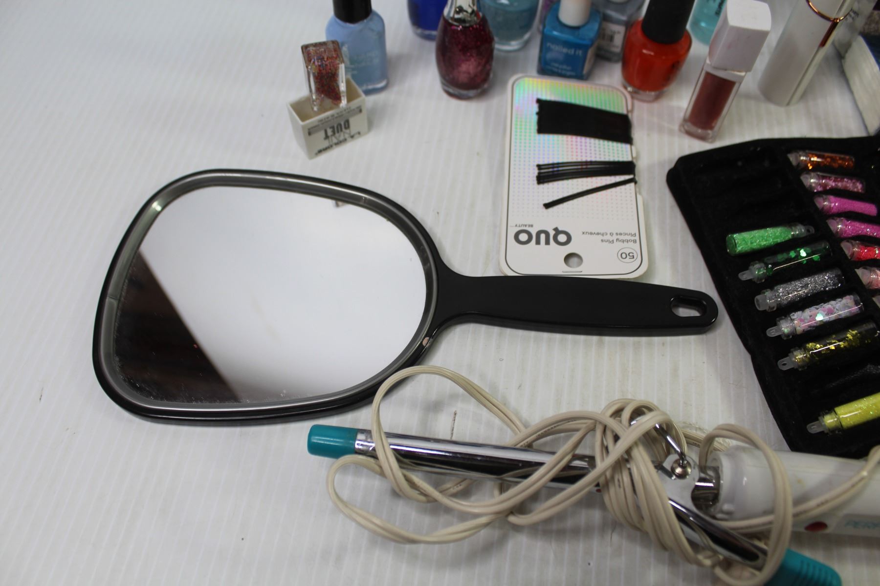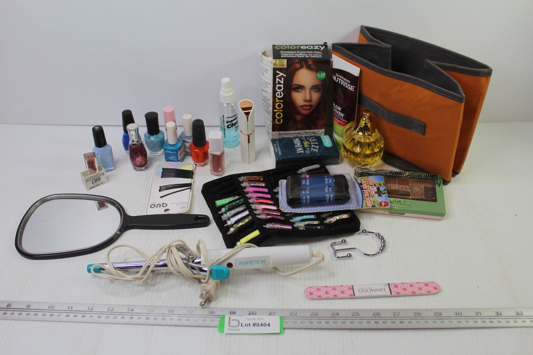 Assorted Cosmetics - Nail Polish - Hair Dye - Curling Iron - Hand Mirror - Perfume