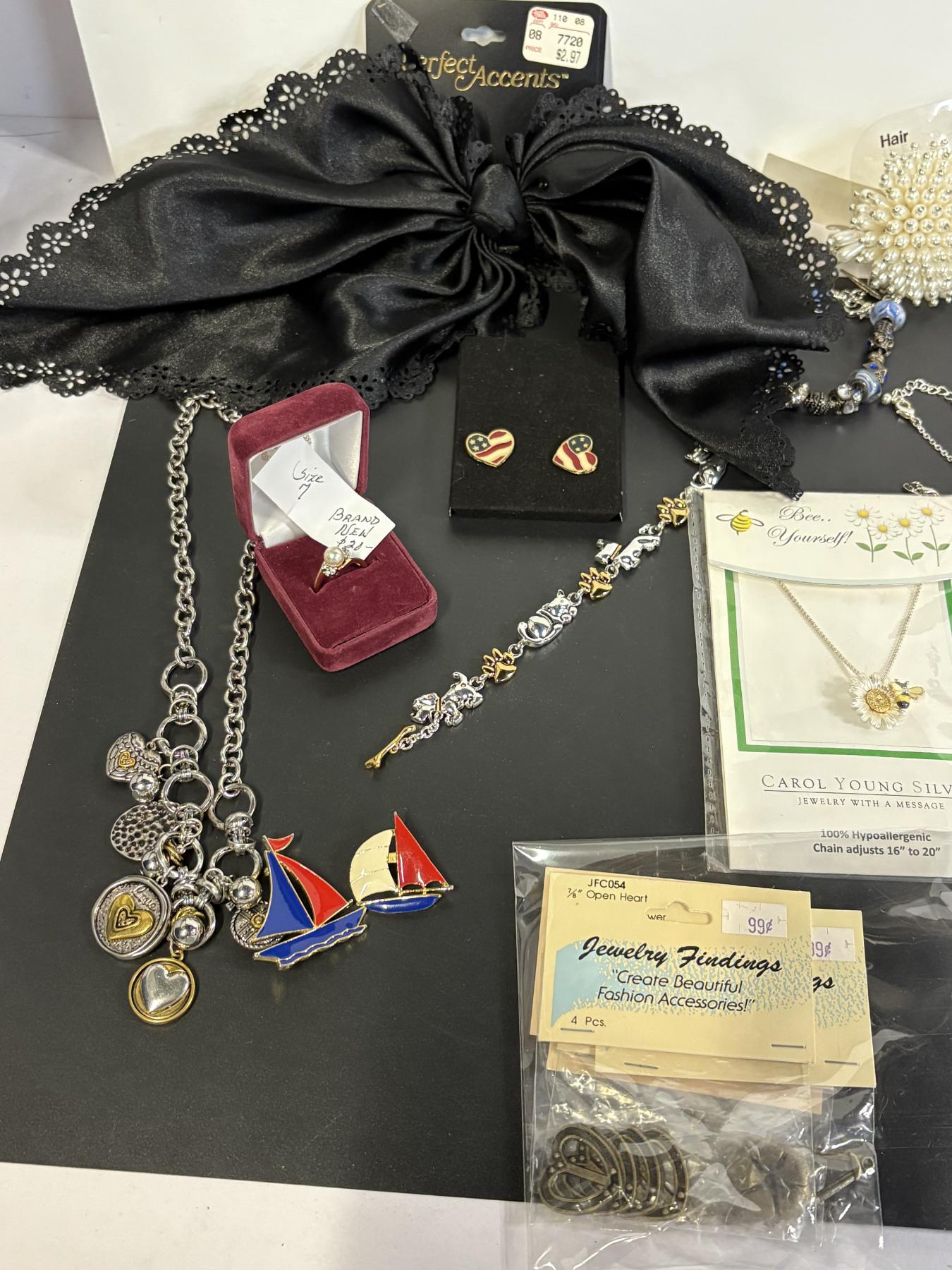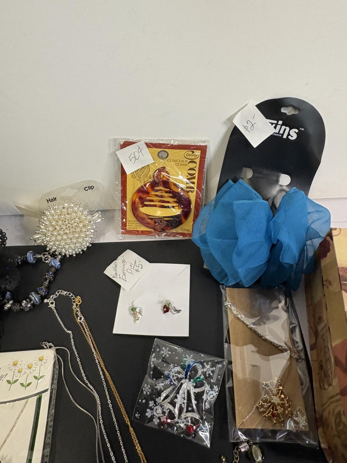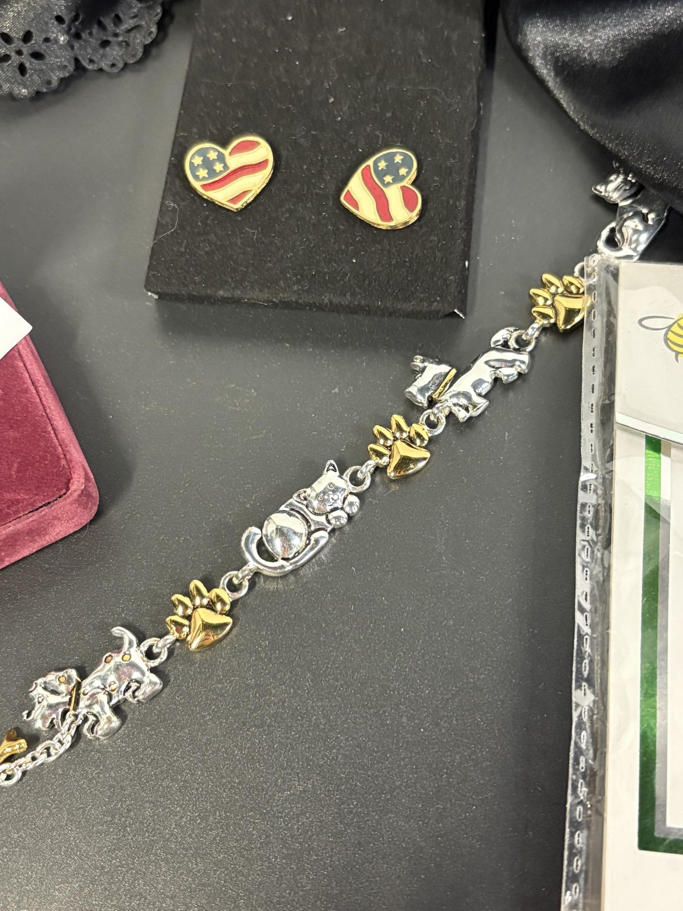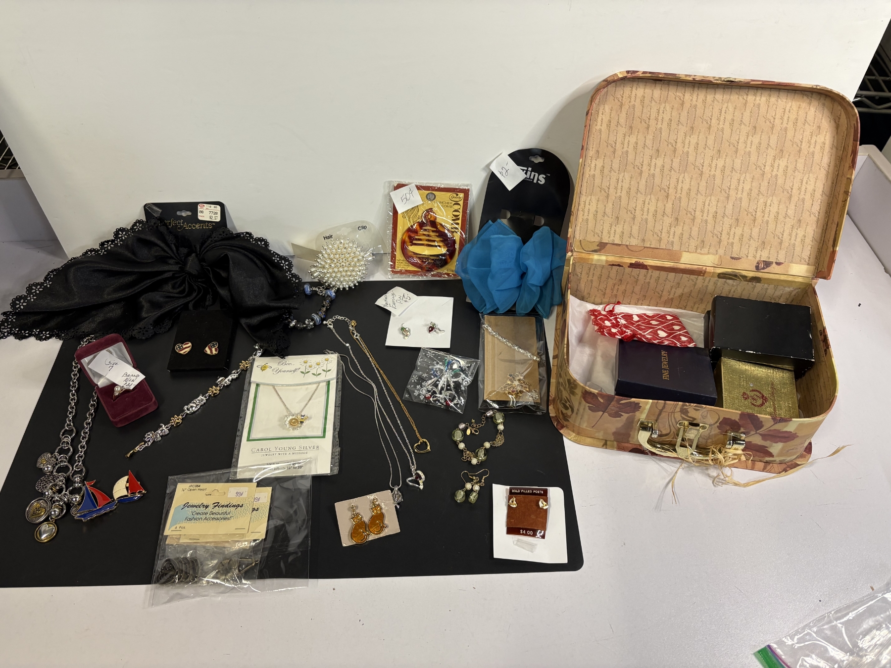 Assorted Costume Jewelry - Includes Jewelry Box & Gold Filled Earrings - Cat & Dog Bracelet - Sailboat Earrings - Stocking Earrings - Bee Necklace - Hair Pins & Bows