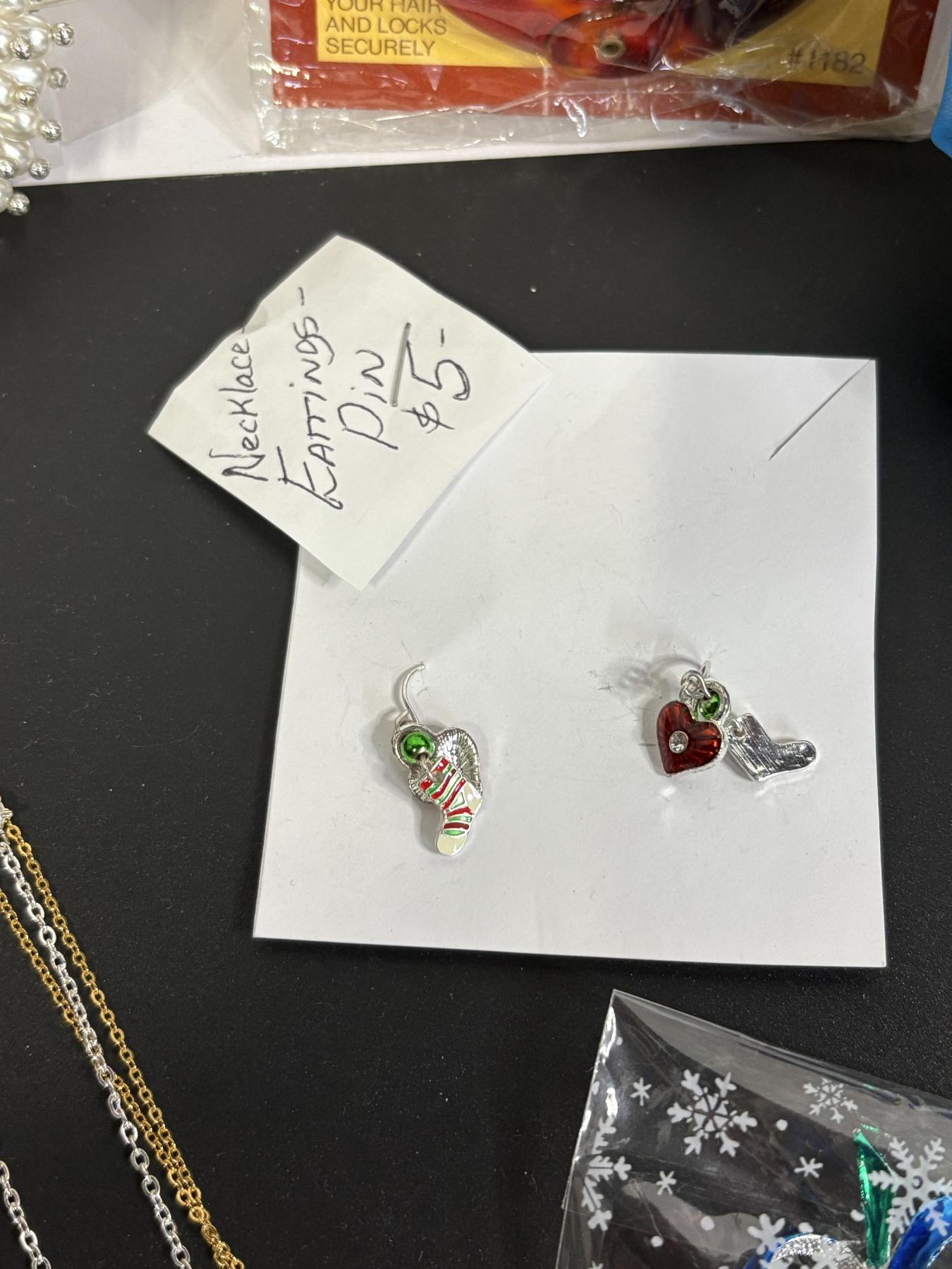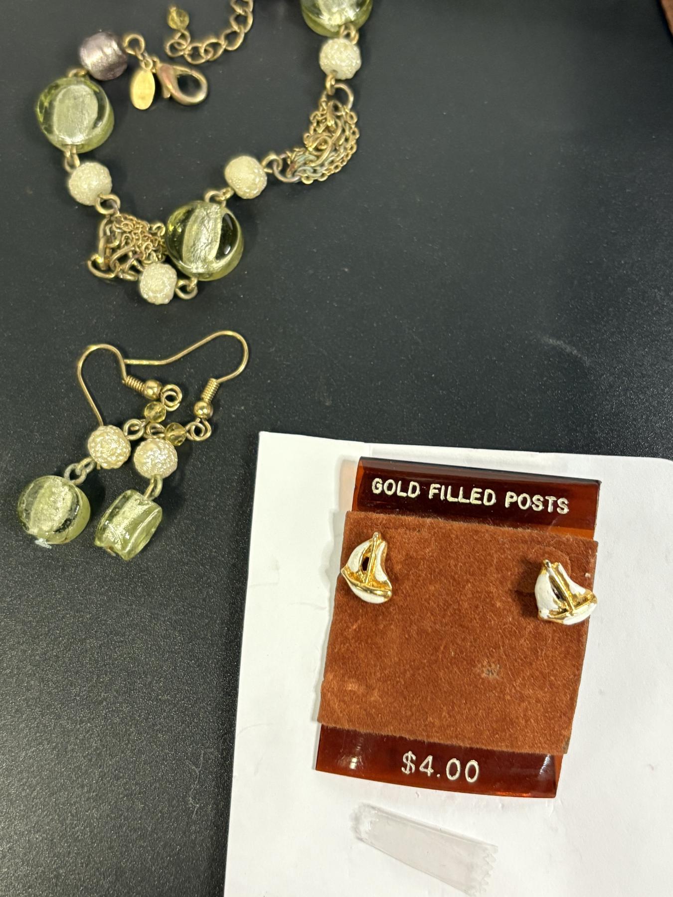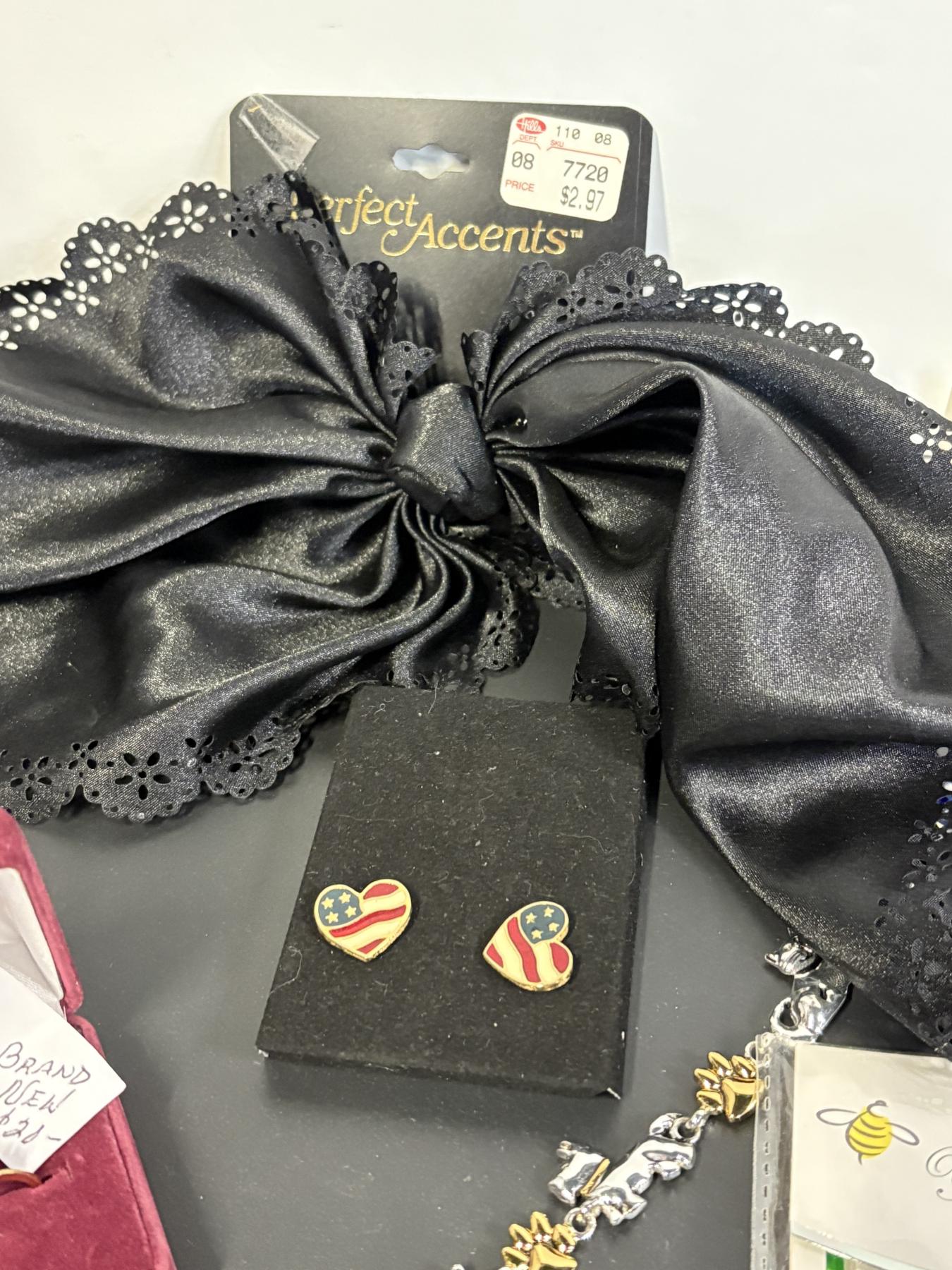 Assorted Costume Jewelry - Includes Jewelry Box & Gold Filled Earrings - Cat & Dog Bracelet - Sailboat Earrings - Stocking Earrings - Bee Necklace - Hair Pins & Bows