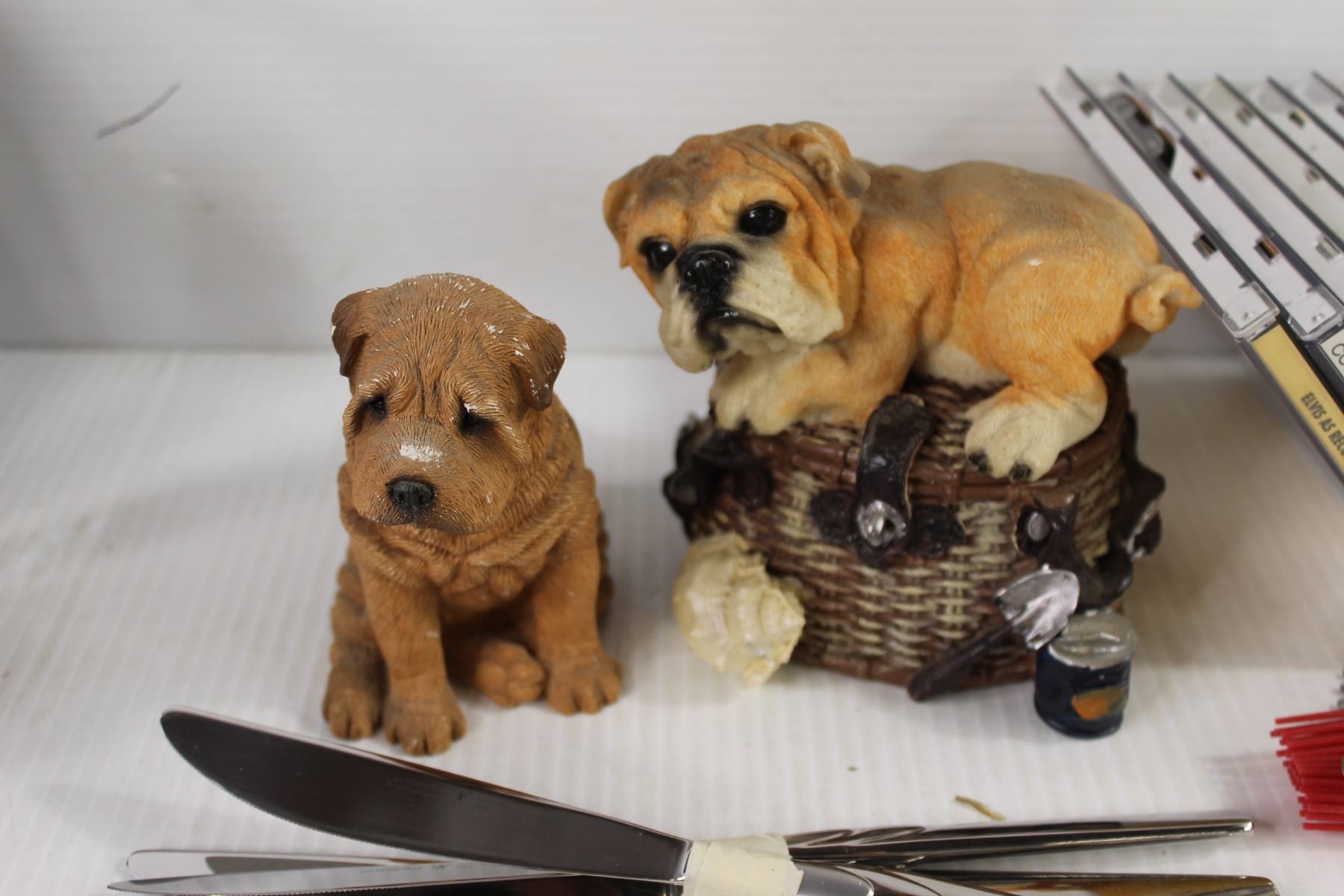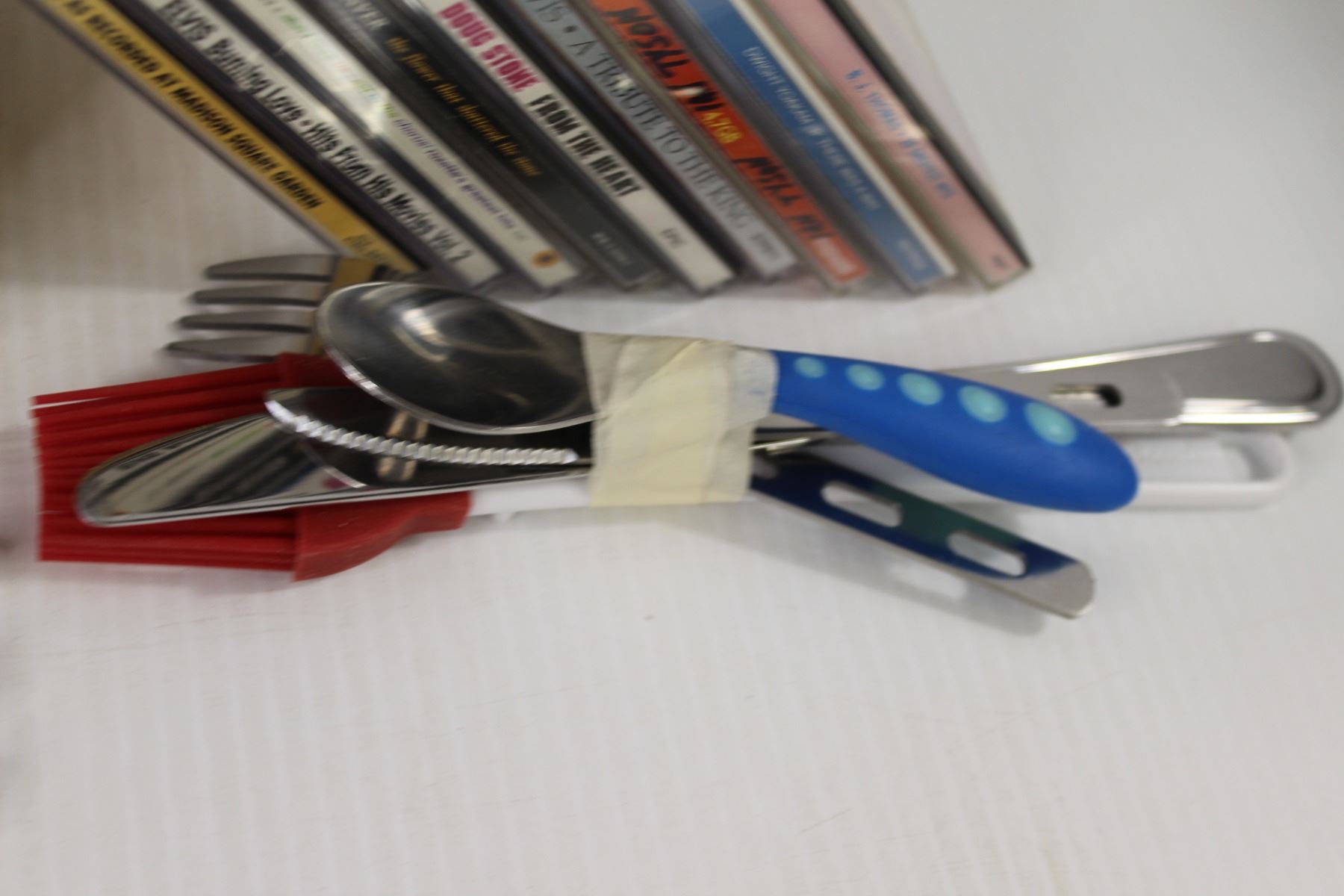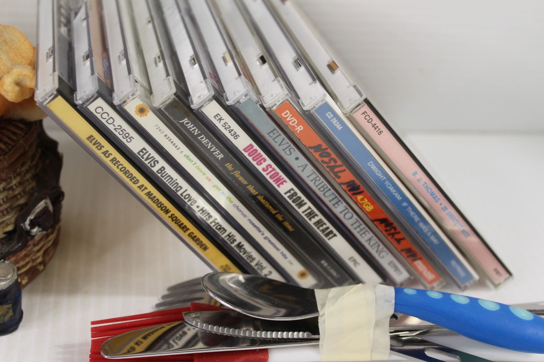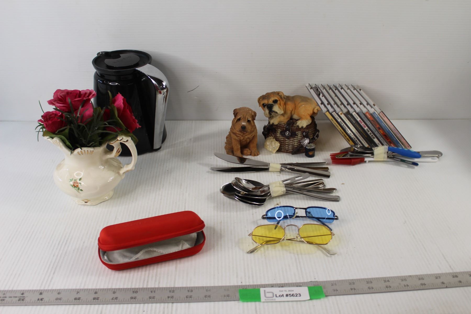 Assorted Cutlery, (2) Glasses, (2) Ceramic Dog Decorations, Kettle, Vase with Artificial Flowers, Assorted CD's - Elvis, John Denver, Doug Stone