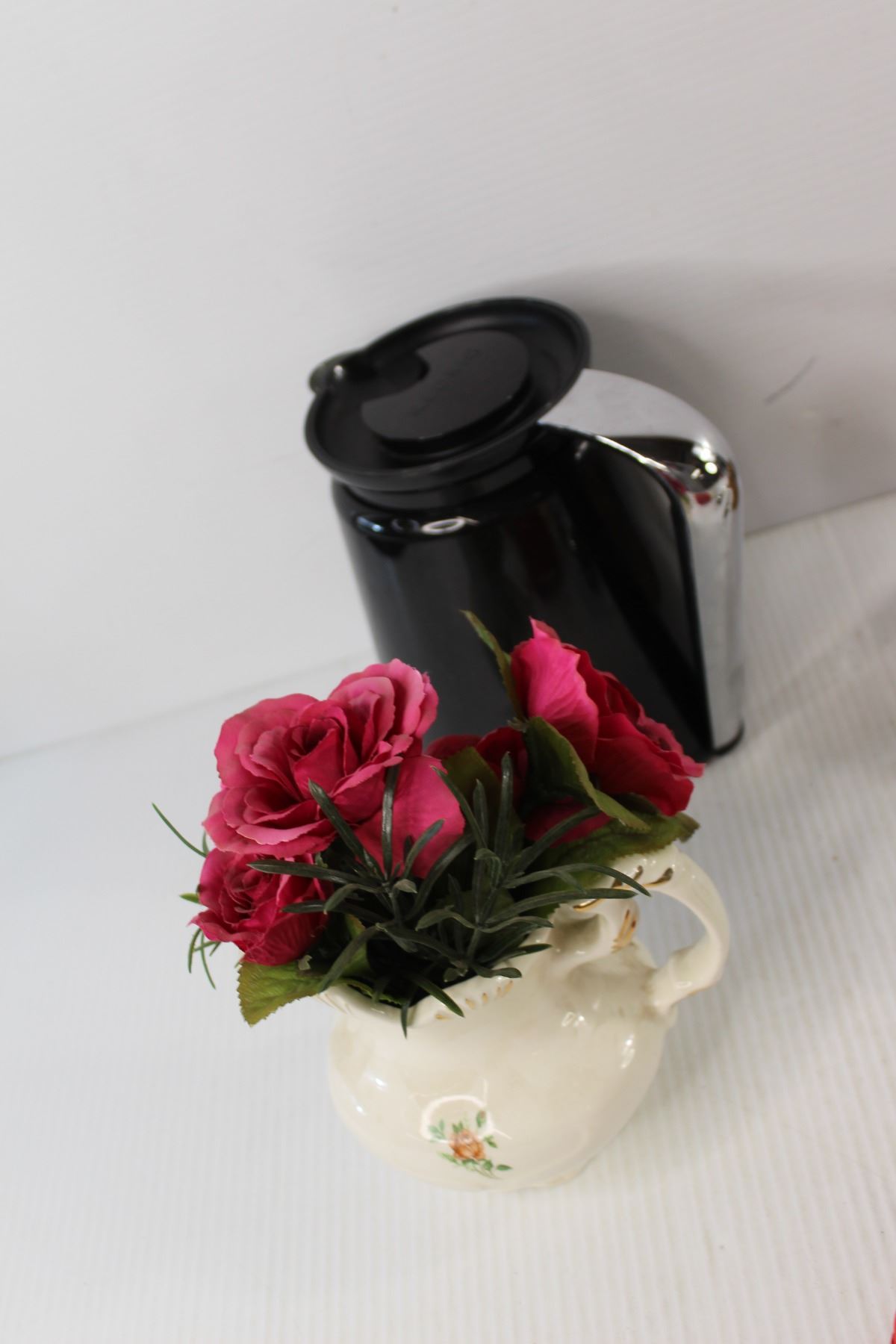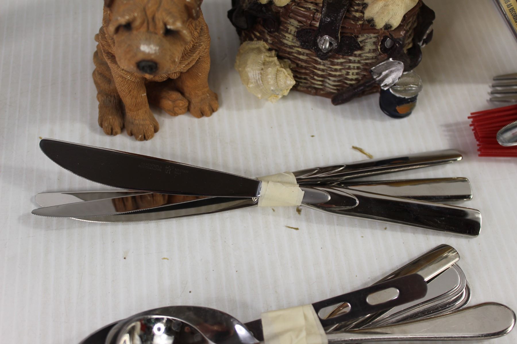Assorted Cutlery, (2) Glasses, (2) Ceramic Dog Decorations, Kettle, Vase with Artificial Flowers, As