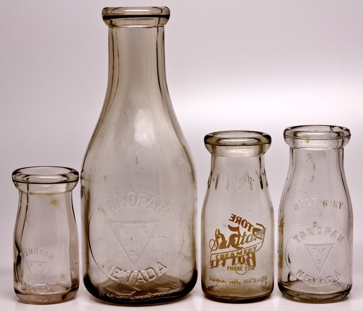 Lot of 4 dairy: 1) A quart size dairy bottle. Slug plate is embossed “Tonopah/ Nevada” flanking a triangular logo bearing the initials T.P.D. in the corners. The lower portion is also embossed “One Quart.” The bottom bears a “Duraglas/ TPD” embossed maker’s mark. Clear glass, excellent condition. 2) One 4" 1/4 pint bottle, embossed slug plate “Tonopah/ Nevada” flanking a triangular logo bearing the initials T.P.D. in the corners. Bottom embossed maker’s mark “T.P.D.” Clear glass, little staining. 3) One bottle, embossed “Half Pint” on front above embossed “Tonopah/ Nevada” slug plate. Bottom bears no maker’s mark. Clear glass, chipped mouth, long crack in base. 4) One bottle, embossed “half pint” on lower rear. Front is silk screened in orange, which has faded in most places to yellow or off-white, “Sanitary/ Creamery/ Phone 2216/ Tonopah, Nevada” and the rear silk screening reads “Store/ 5 c/ Bottle.” The neck is ribbed and the bottom bears a faint “Store” embossed maker’s mark. This silk-screened bottle is extremely rare, while its embossed mates are common [Ref: Nevada History Through Glass, Vol 1, Fred Holabird, 2012, p. 272]. - Jacobitz Collection -59520