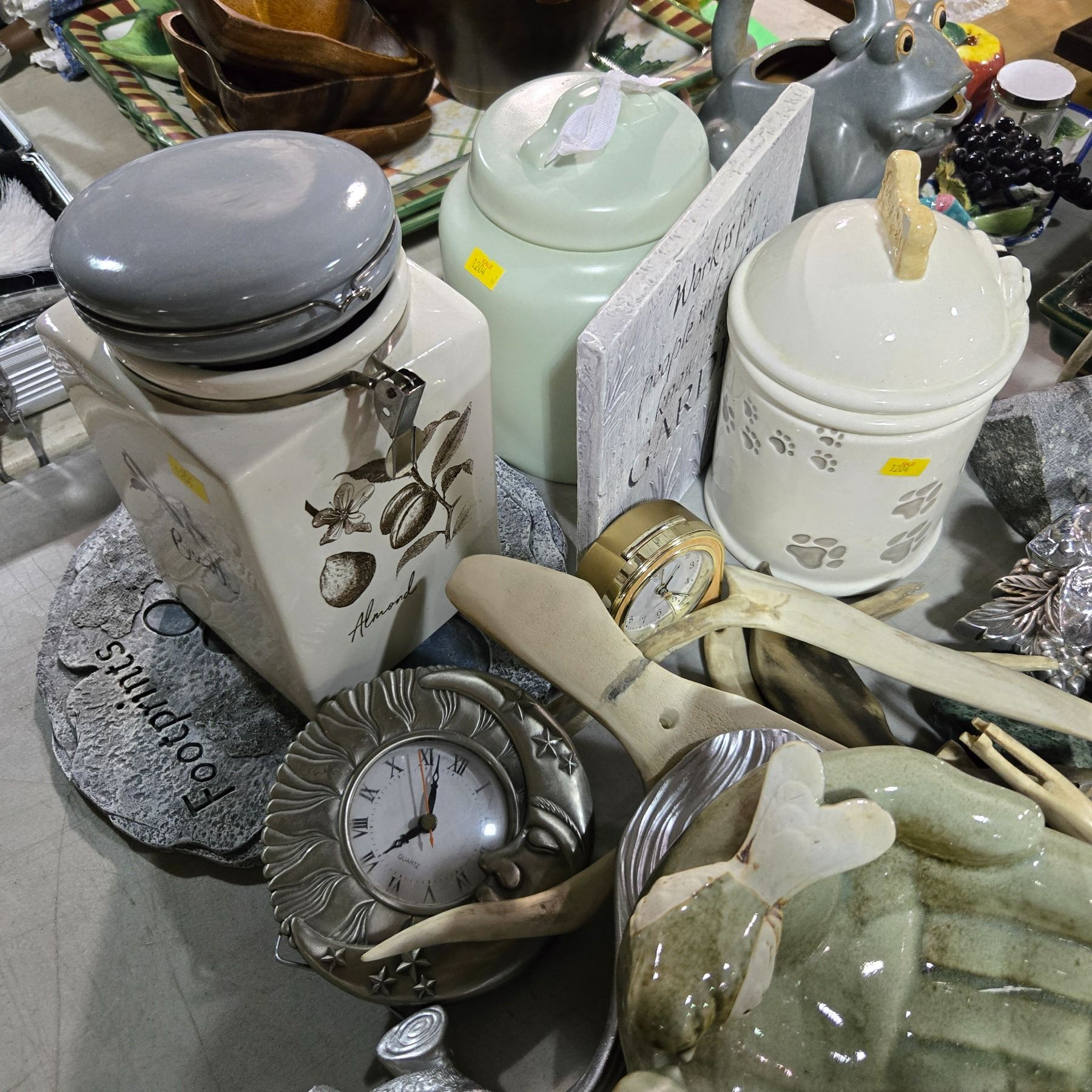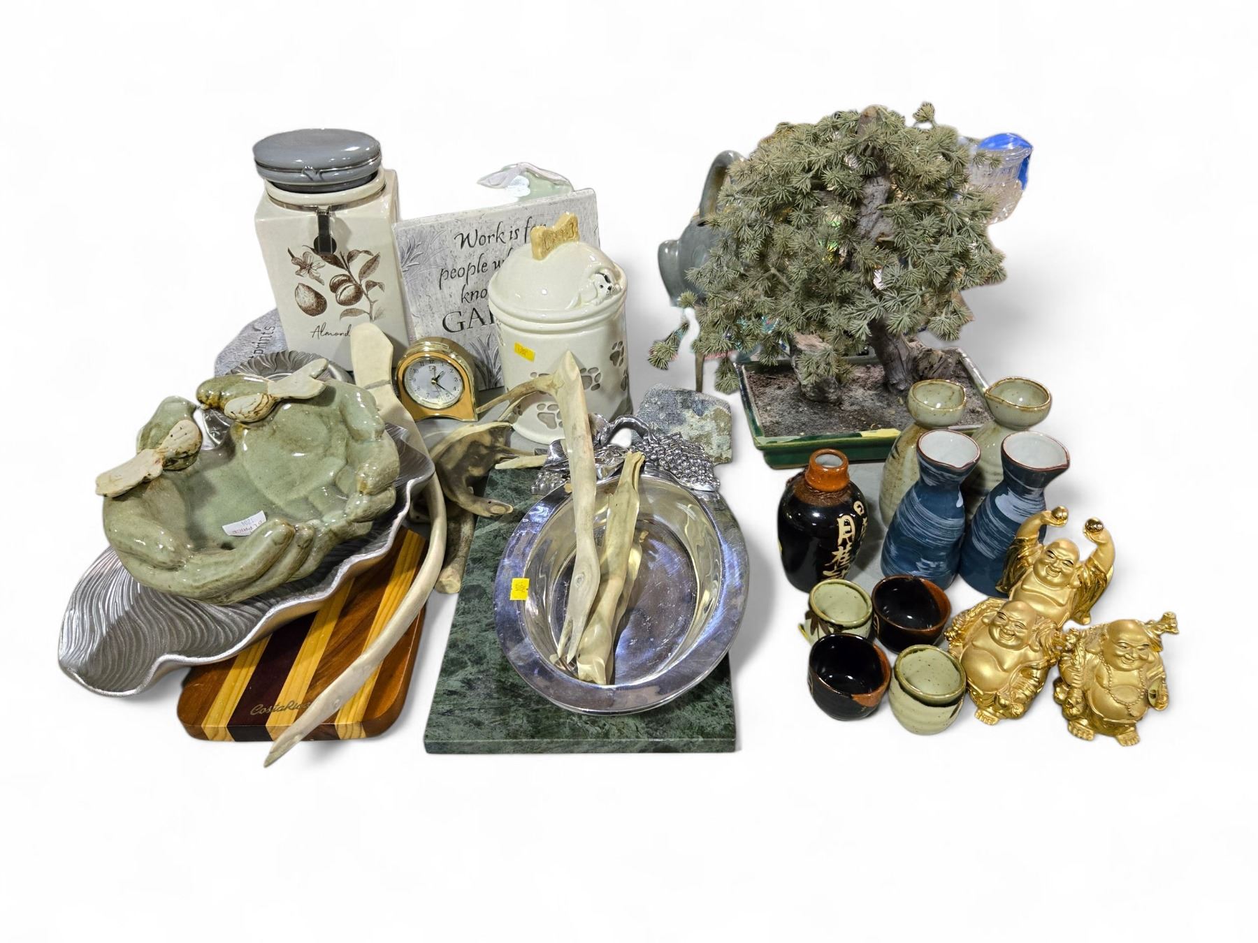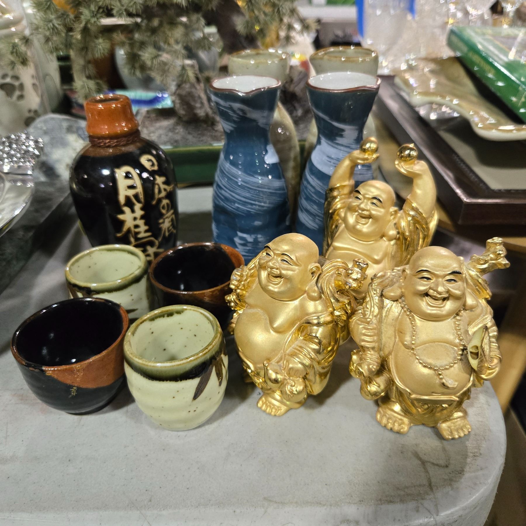 Assorted Decorative Items: Laughing Buddha Figurines, Japanese Ceramic Sake and Cups, Cookie Jars and Platters